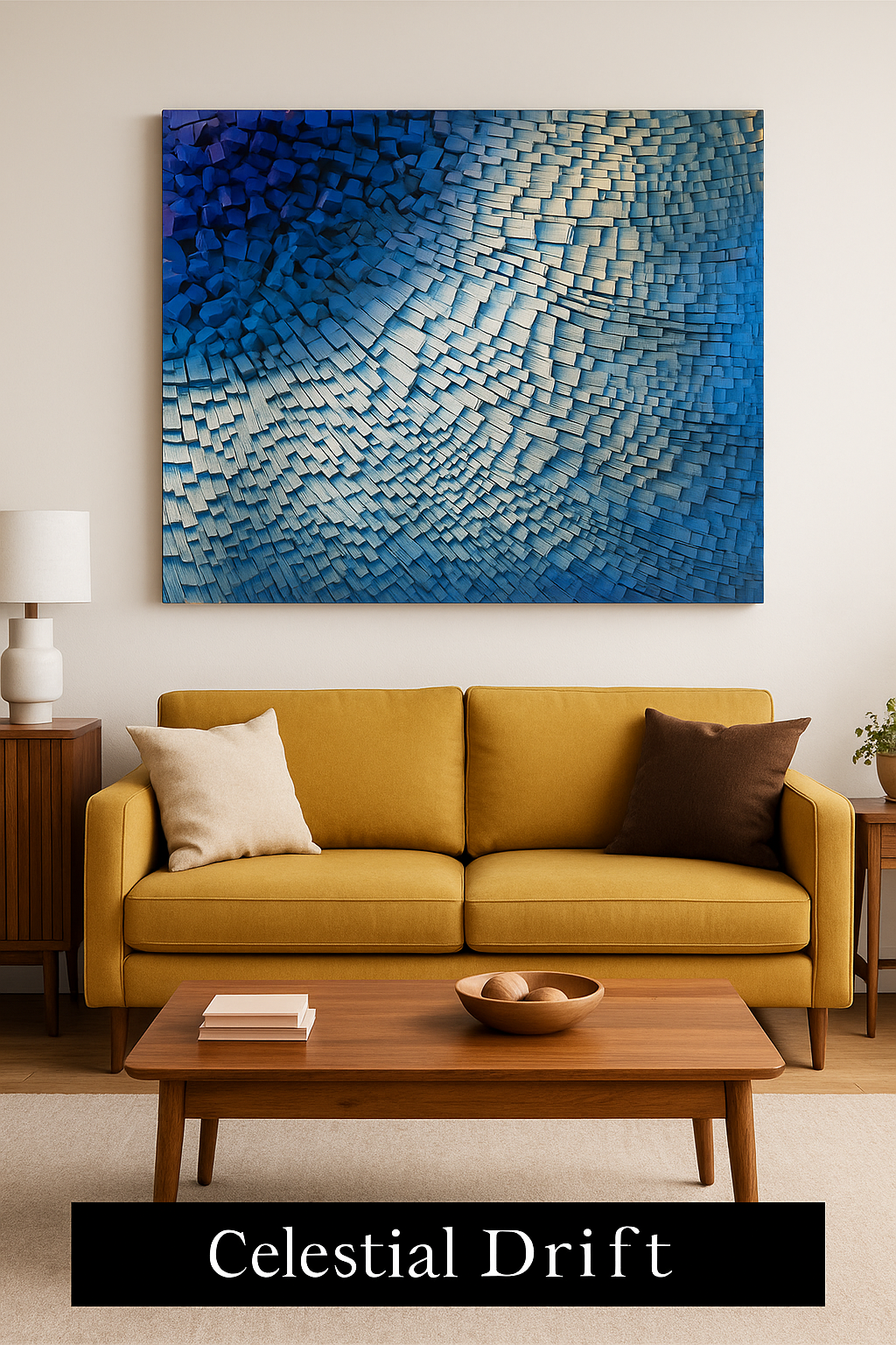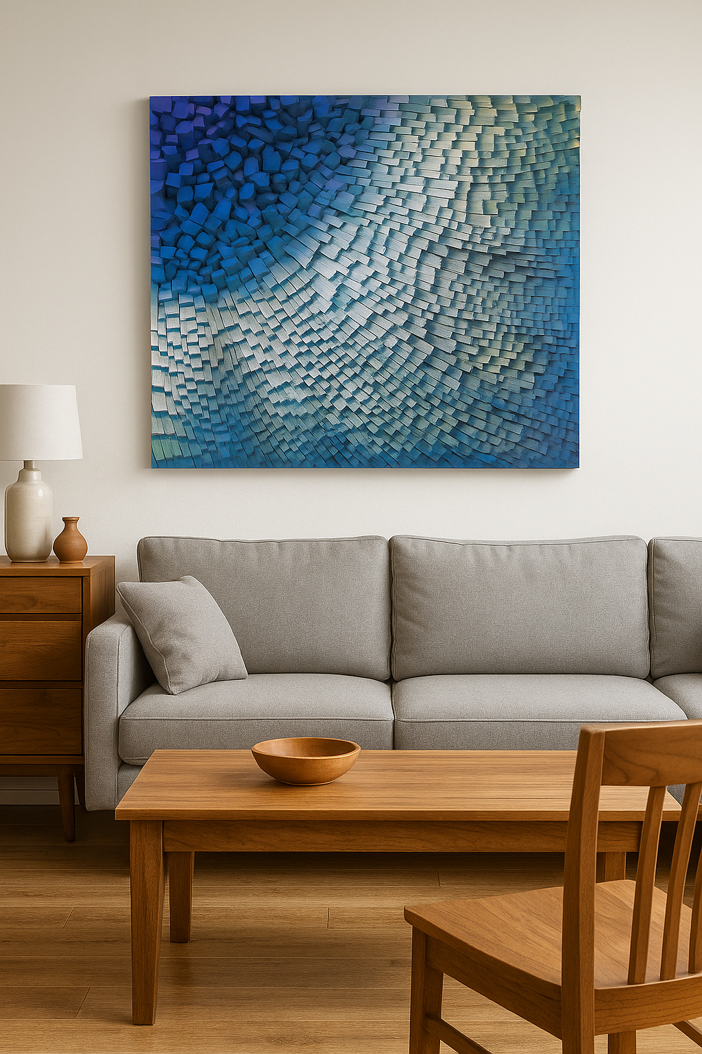 Immerse your space in the cool elegance of Arctic Currents, a captivating 3D mosaic handcrafted from premium pine wood. Each wooden block is individually cut, sanded, and painted in flowing shades of deep indigo, icy teal, and silver-white, creating a dynamic wave-like motion. This one-of-a-kind piece brings both texture and movement to your walls, blending artistry with natural materials for a truly high-impact statement.