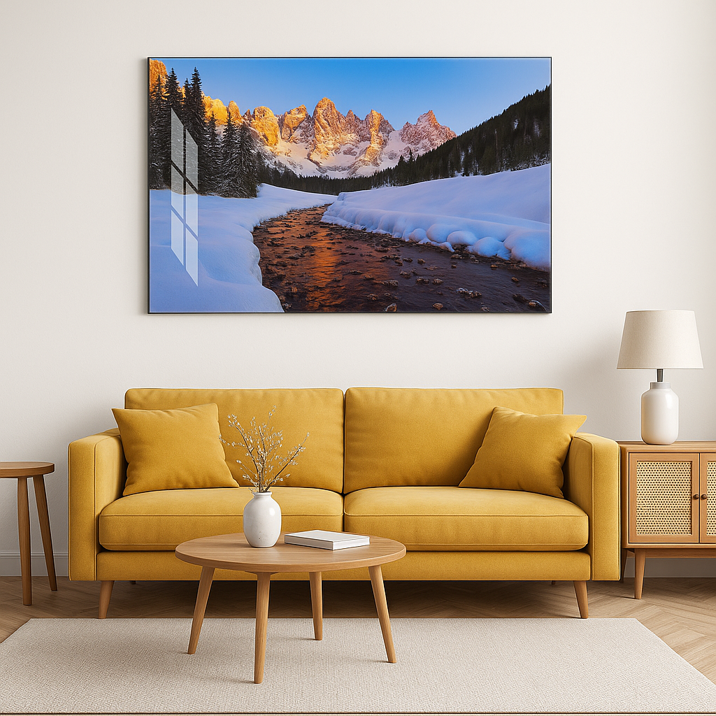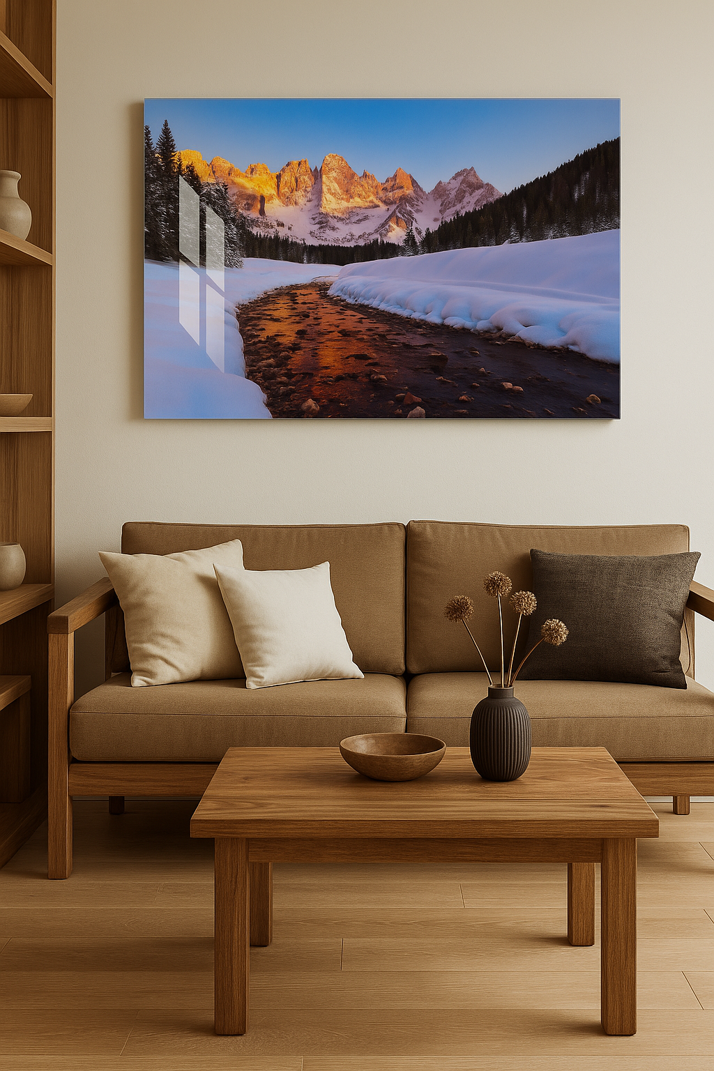 Bask in the golden glow of dawn as the first light kisses snow-clad peaks in Aurora’s Embrace. This premium glass wall art captures the pristine beauty of an alpine sunrise, with molten hues reflected in a crystal-clear stream cutting through a serene winter wonderland. A masterpiece for those who crave nature’s majesty in vivid detail, crafted to transform your living space into a window to the wild.