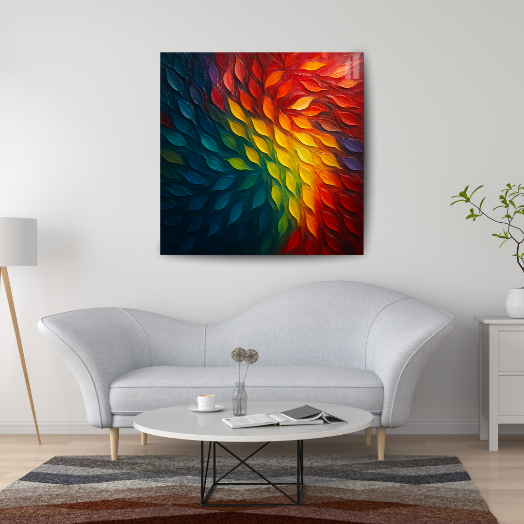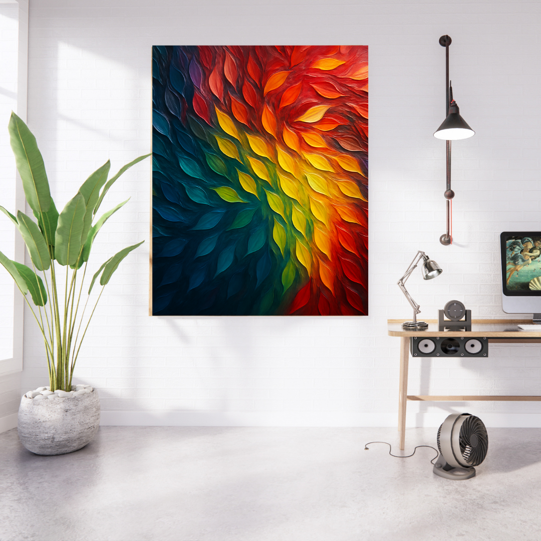 Immerse your space in motion and color with Chromatic Flow — a high-gloss, 3D impasto masterpiece where flame-like strokes ripple across the canvas in a vibrant spectrum. From cool ocean blues to fiery reds, each sculpted brushstroke bursts with texture, energy, and emotion. A bold statement of transformation, creativity, and modern elegance.