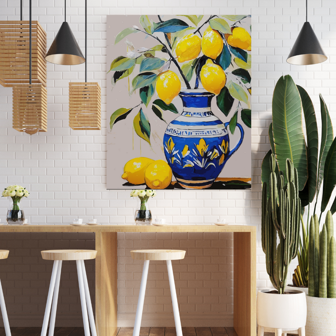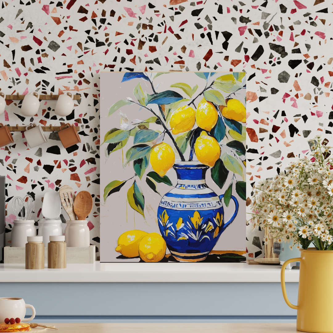 Fresh, vibrant, and full of Mediterranean charm—Citrus Bloom brings a burst of sunshine to your space. Featuring golden lemons nestled in lush greenery inside a hand-painted blue ceramic jug, this wall art adds warmth, joy, and rustic elegance to kitchens, dining rooms, or cozy corners.
