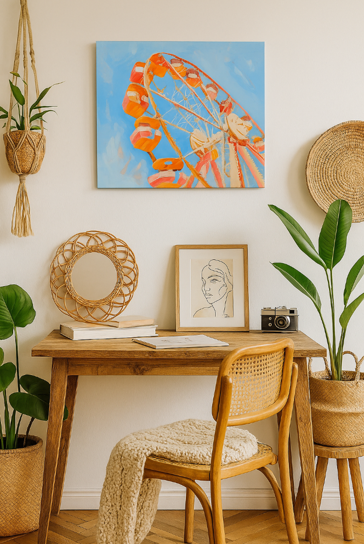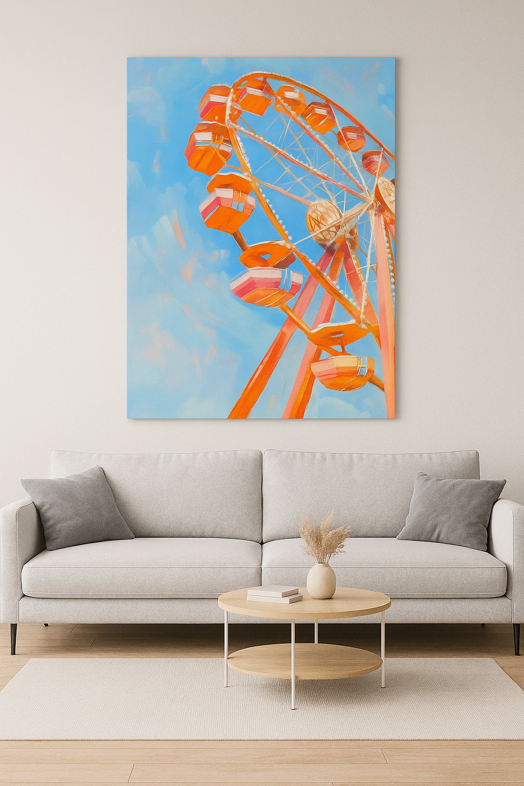 Bold lines and electric colors bring the skyline to life in City Whirl. This modern ferris wheel artwork spins with energy, edge, and attitude—perfect for urban lofts or contemporary walls that speak loud and clear.