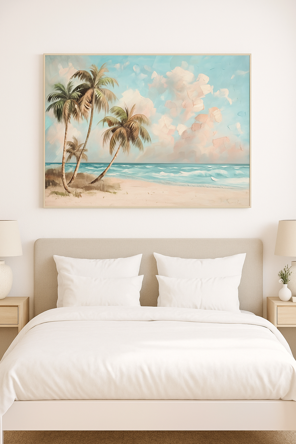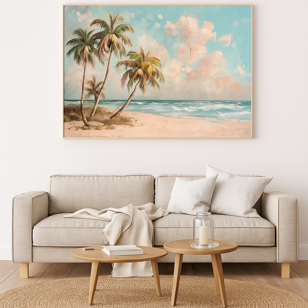 Drift into serenity with Coastal Whisper, a dreamy blend of pastel skies, swaying palms, and turquoise tides. This textured beachscape brings a breath of ocean breeze and relaxed island vibes to any space — perfect for your modern coastal retreat.