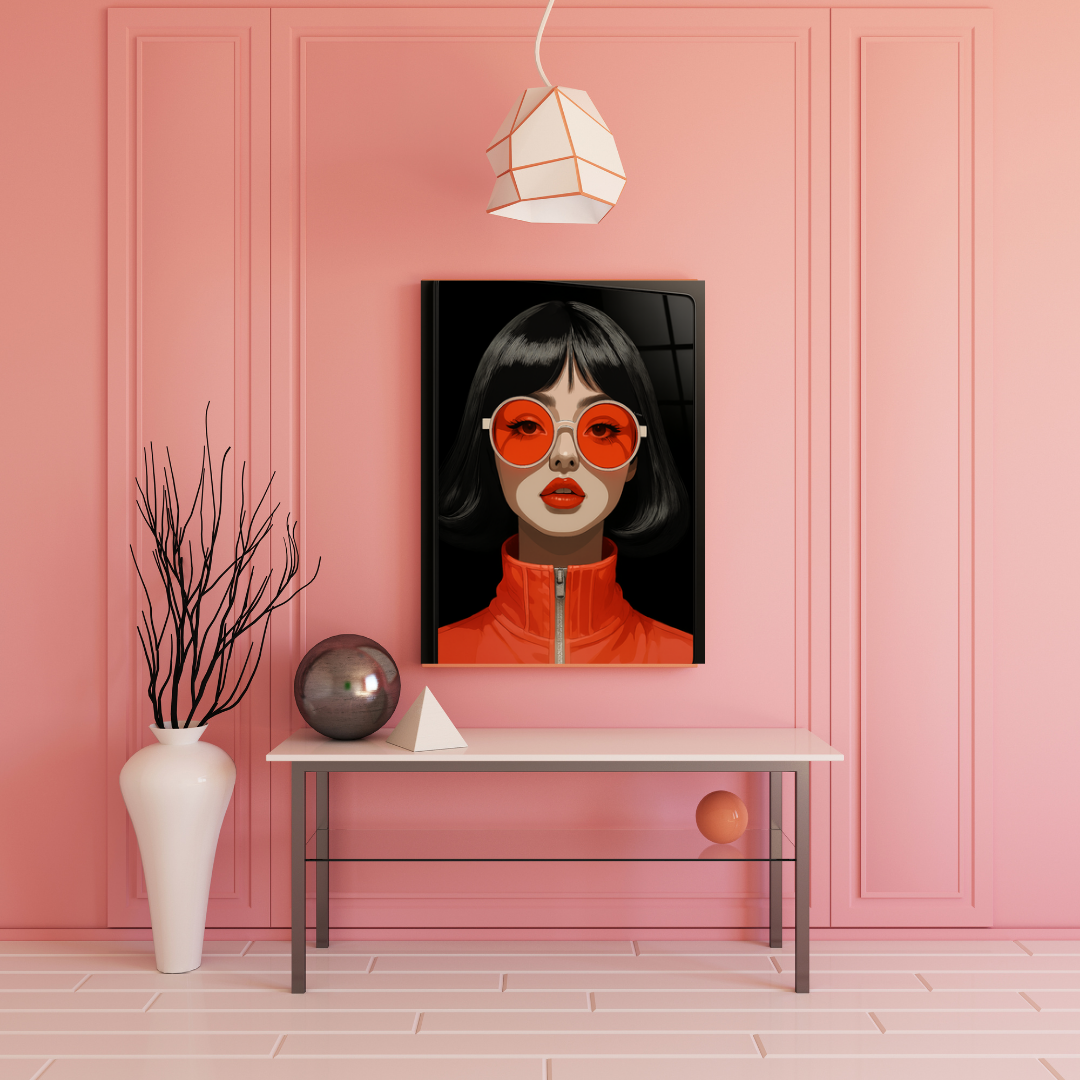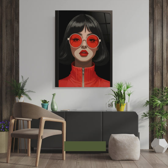 Bold, sleek, and unapologetically cool—Crimson Glare captures a pop-art portrait of attitude and allure. With striking red tones, oversized shades, and a glossy finish, this glass wall art turns any wall into a style statement. Perfect for modern, fashion-forward interiors.