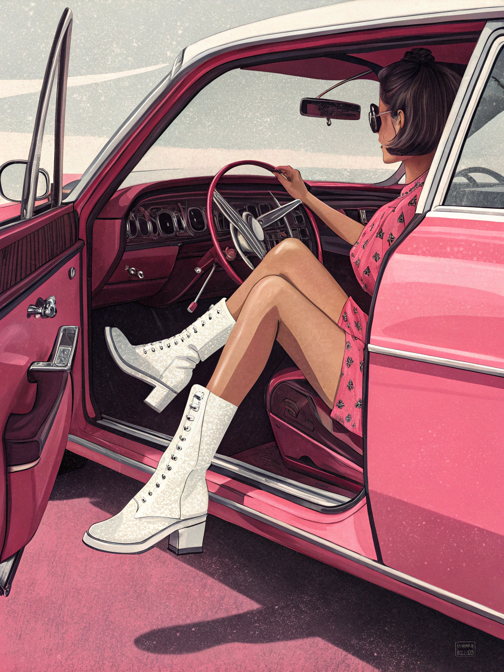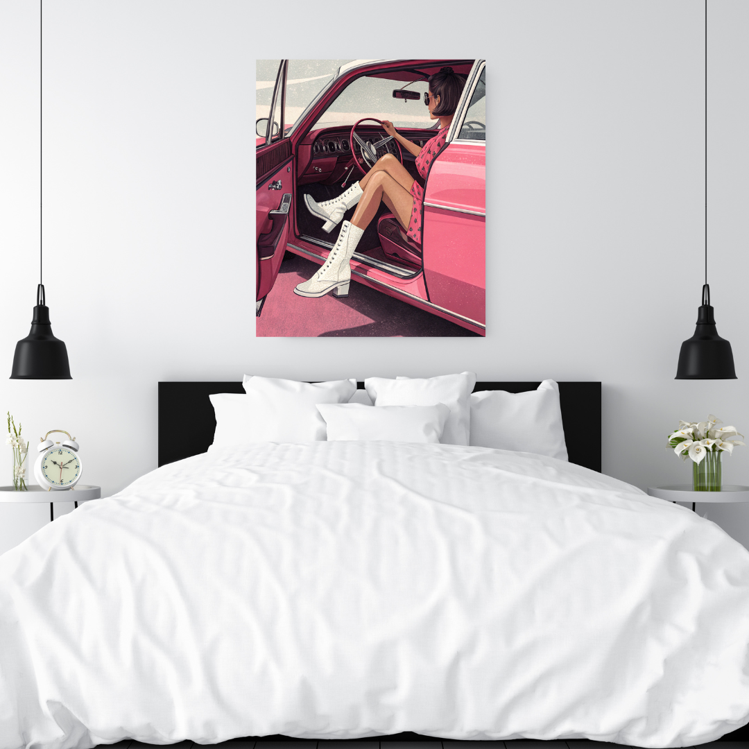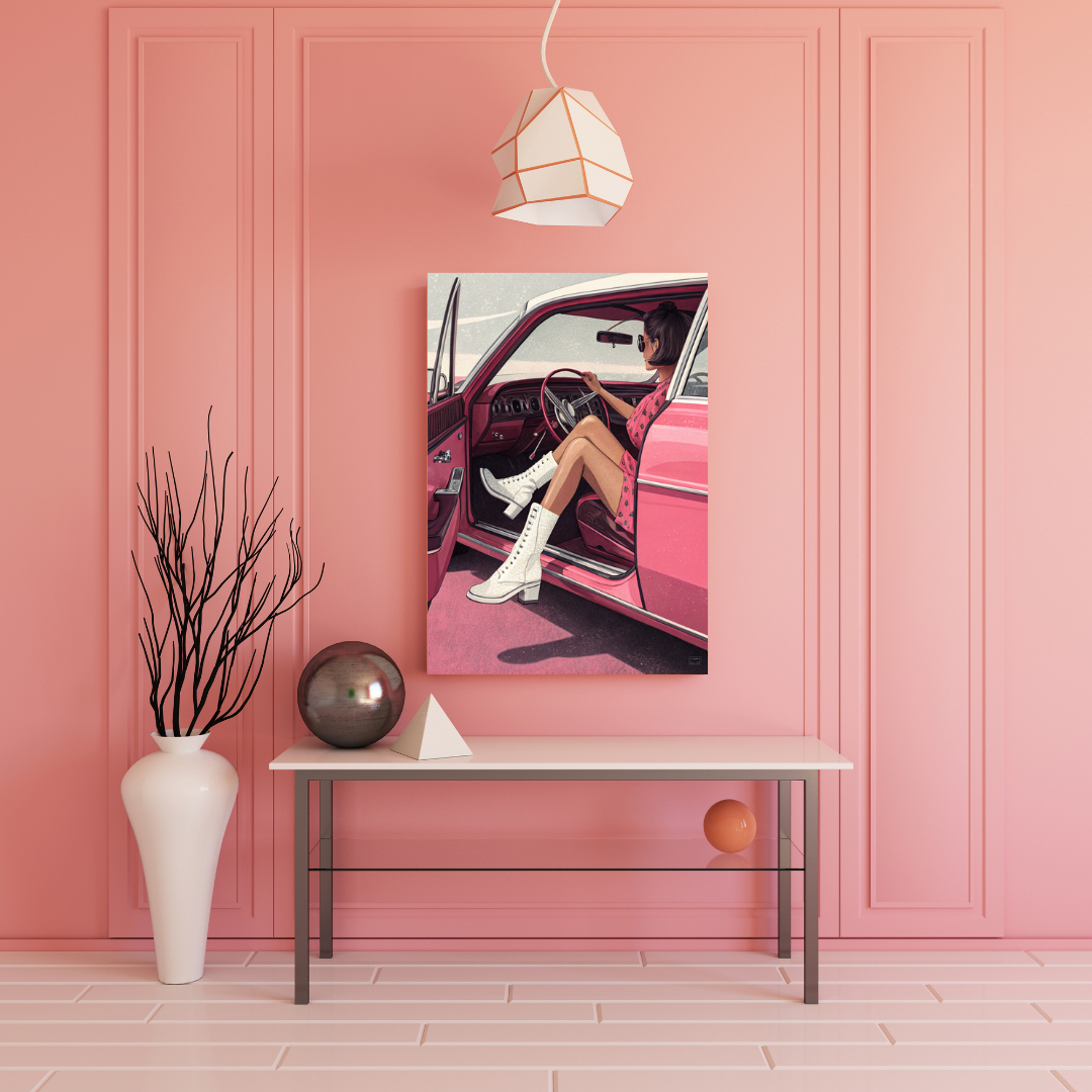 Drive in Style is a retro-chic celebration of sass, speed, and vintage glamour. Featuring a confident woman in white boots and a pink mini dress behind the wheel of a classic car, this bold artwork bursts with nostalgic attitude and feminine power. A perfect pick for fashionistas, car lovers, or any space craving a pop of playful cool.