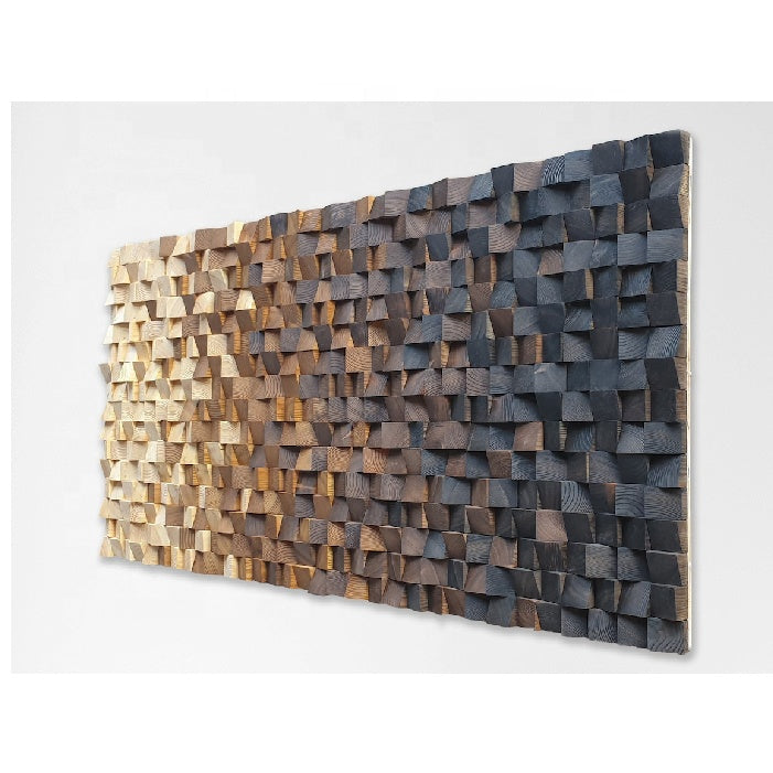 Eclipse Drift is a captivating handmade wood wall art piece, meticulously crafted from individually carved and stained wooden blocks. Each segment is shaped by hand, creating a rich texture and a seamless gradient that flows from warm golden oak tones to deep charcoal hues. This artisanal creation brings depth, warmth, and modern sophistication, transforming any wall into a statement of craftsmanship and style.