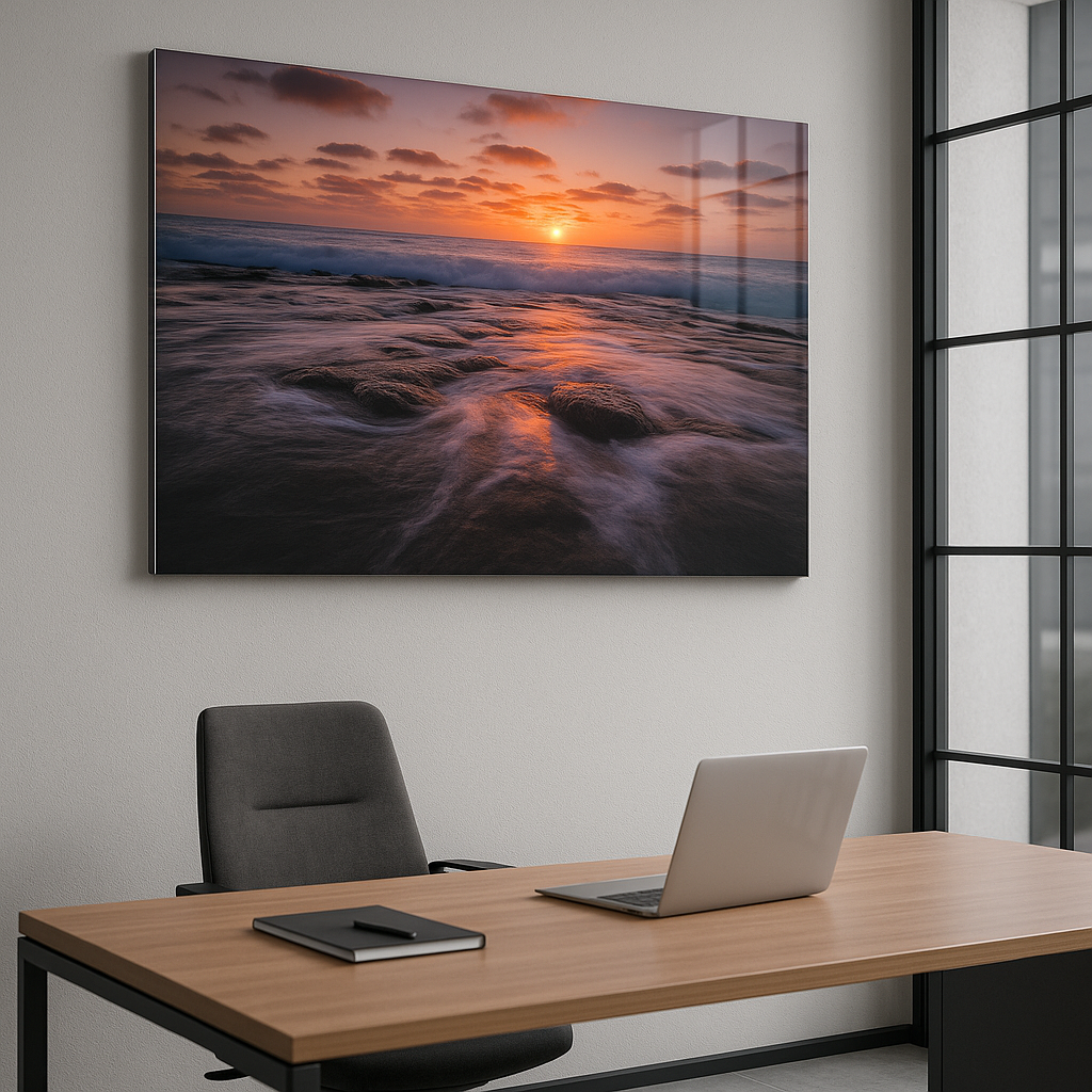 Immerse your space in the tranquil elegance of Elysian Horizon — a premium glass wall art piece capturing the fiery glow of a sunset as waves embrace the rocky shore. Its high-definition clarity and luminous depth create a gallery-worthy statement, radiating serenity and timeless coastal beauty.