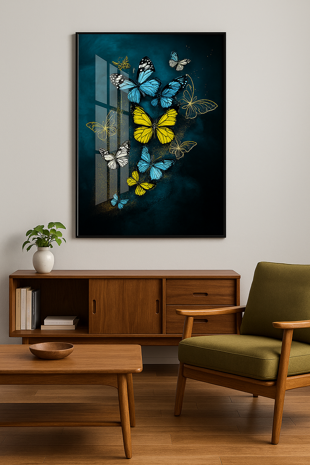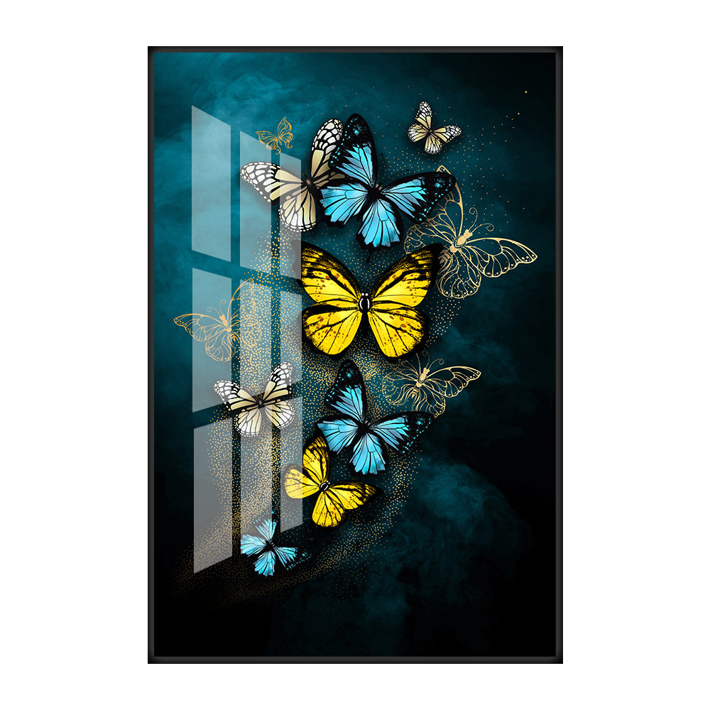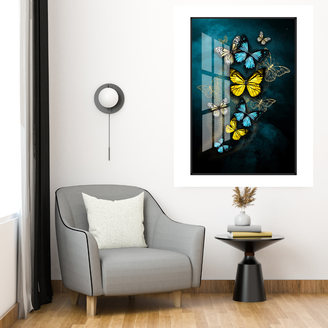 Bring a burst of color and movement to your space with Ethereal Flight, a mesmerizing glass wall art piece featuring vibrant yellow and azure butterflies dancing through a dreamy teal mist. The glossy glass finish enhances the depth and brilliance of each delicate wing, while the play of light creates a sense of motion and freedom. Perfect for adding elegance, vibrance, and an uplifting energy to any modern interior.