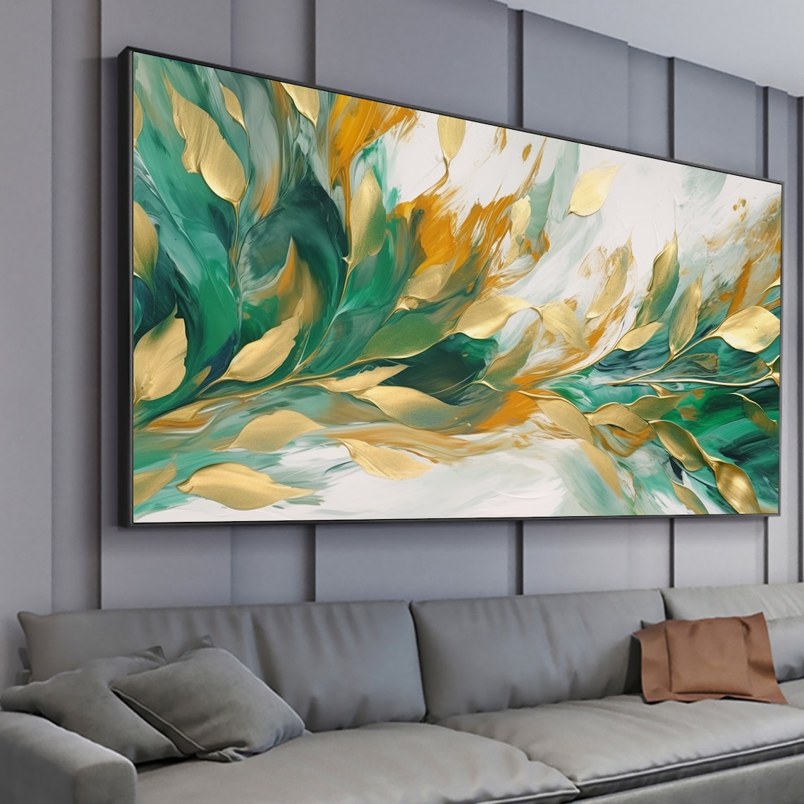 Golden Bloom is where elegance meets motion—featuring cascading metallic gold leaves sweeping through lush emerald and amber brushstrokes. This opulent piece radiates harmony, prosperity, and refined energy, making it the perfect statement for sophisticated interiors that embrace nature with a modern twist.
