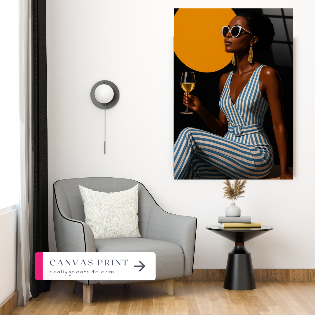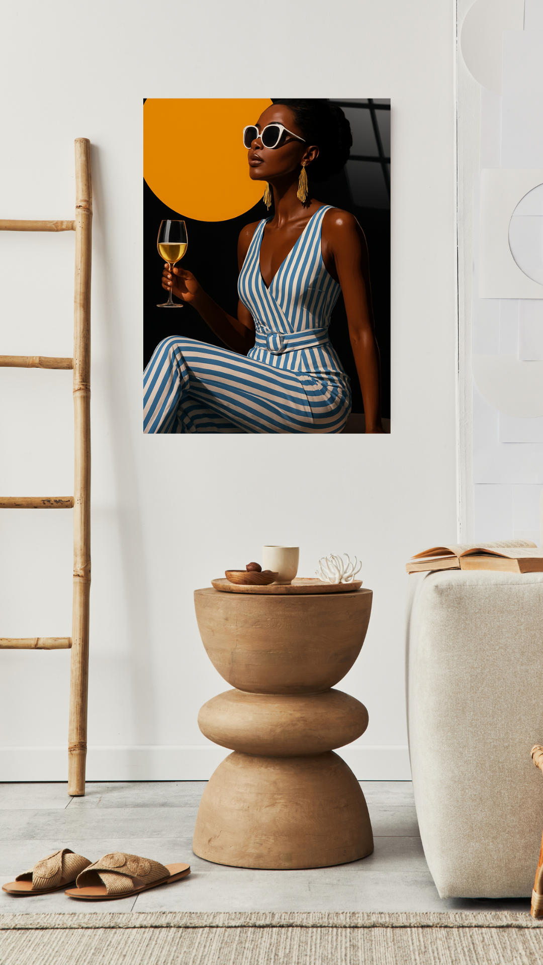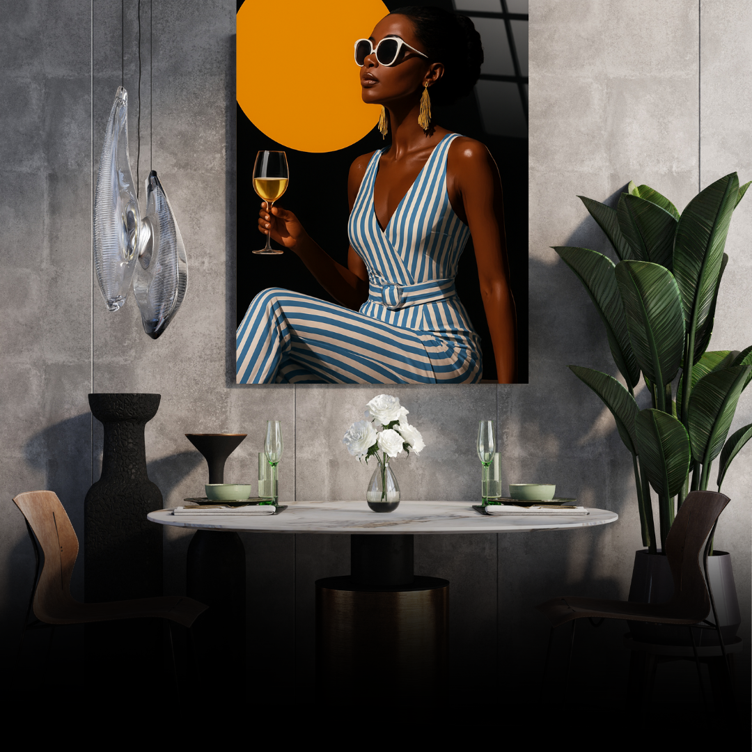 Bold, radiant, and unapologetically stylish — Golden Hour Chic captures a modern muse in sun-drenched elegance, sipping wine beneath a blazing orange sun. This glass wall art blends retro glam with contemporary cool, making it a perfect piece for fashion-forward spaces, lounges, or statement walls. A celebration of confidence, color, and summertime sophistication.