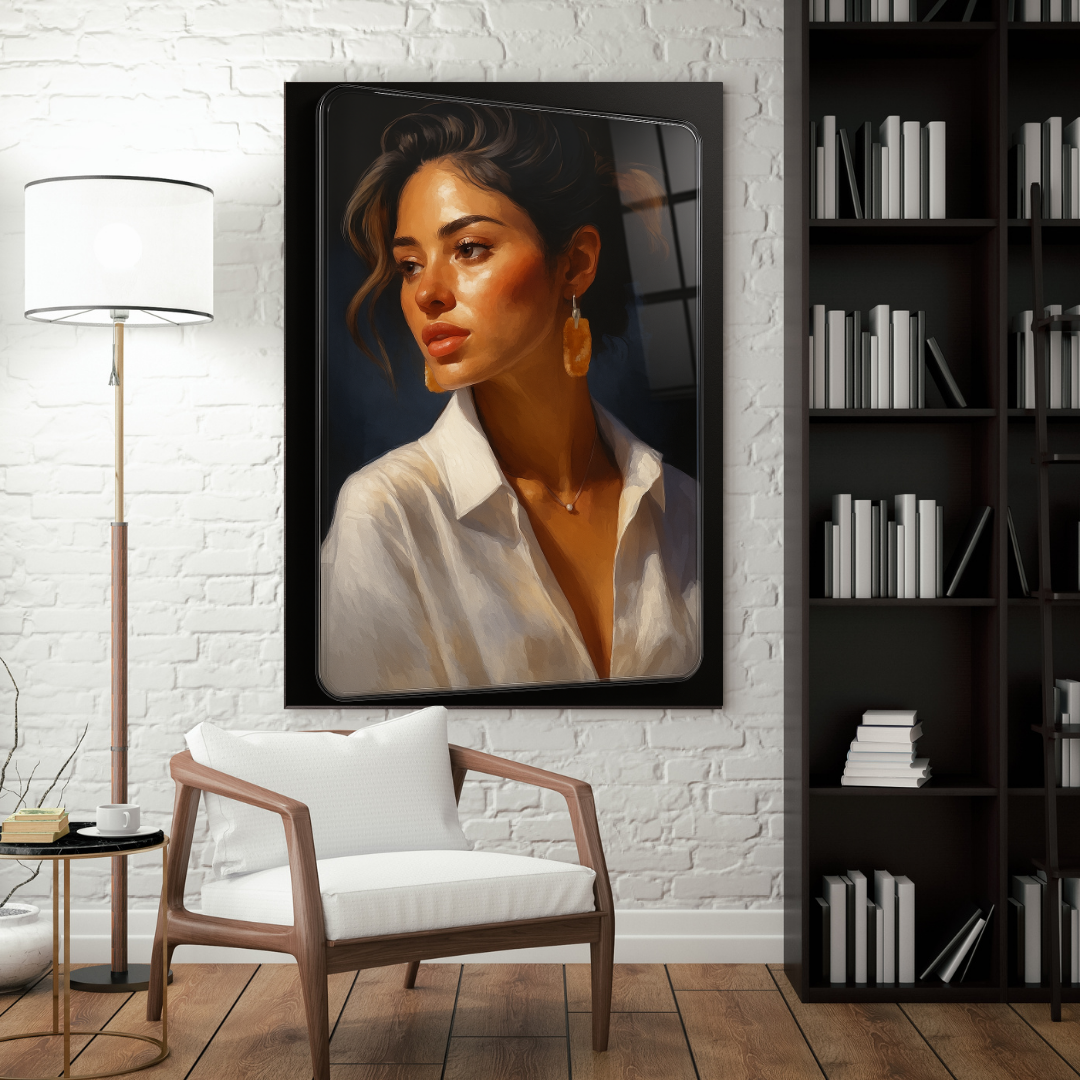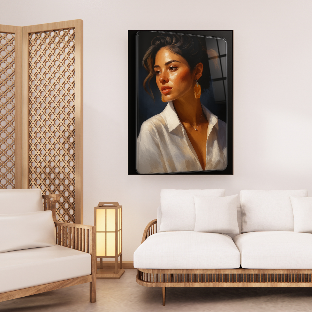 Bathed in the soft glow of dusk, Golden Hour Muse captures a moment of quiet strength and grace. Her gaze tells a story—warm, reflective, and timeless. Encased in glossy glass, this elegant portrait adds depth, sophistication, and soul to any space.