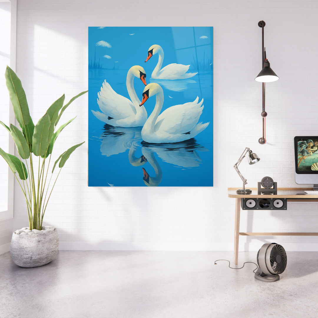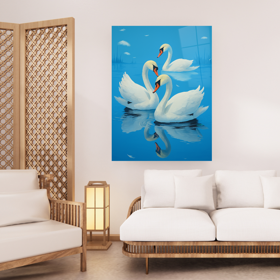 Elegant and serene, Grace in Stillness features three swans gliding across a tranquil lake, their reflections rippling softly beneath them. This modern glass wall art embodies peace, purity, and connection—perfect for creating a calming ambiance with a romantic touch of nature.