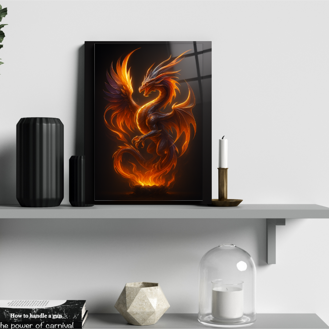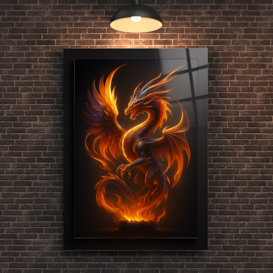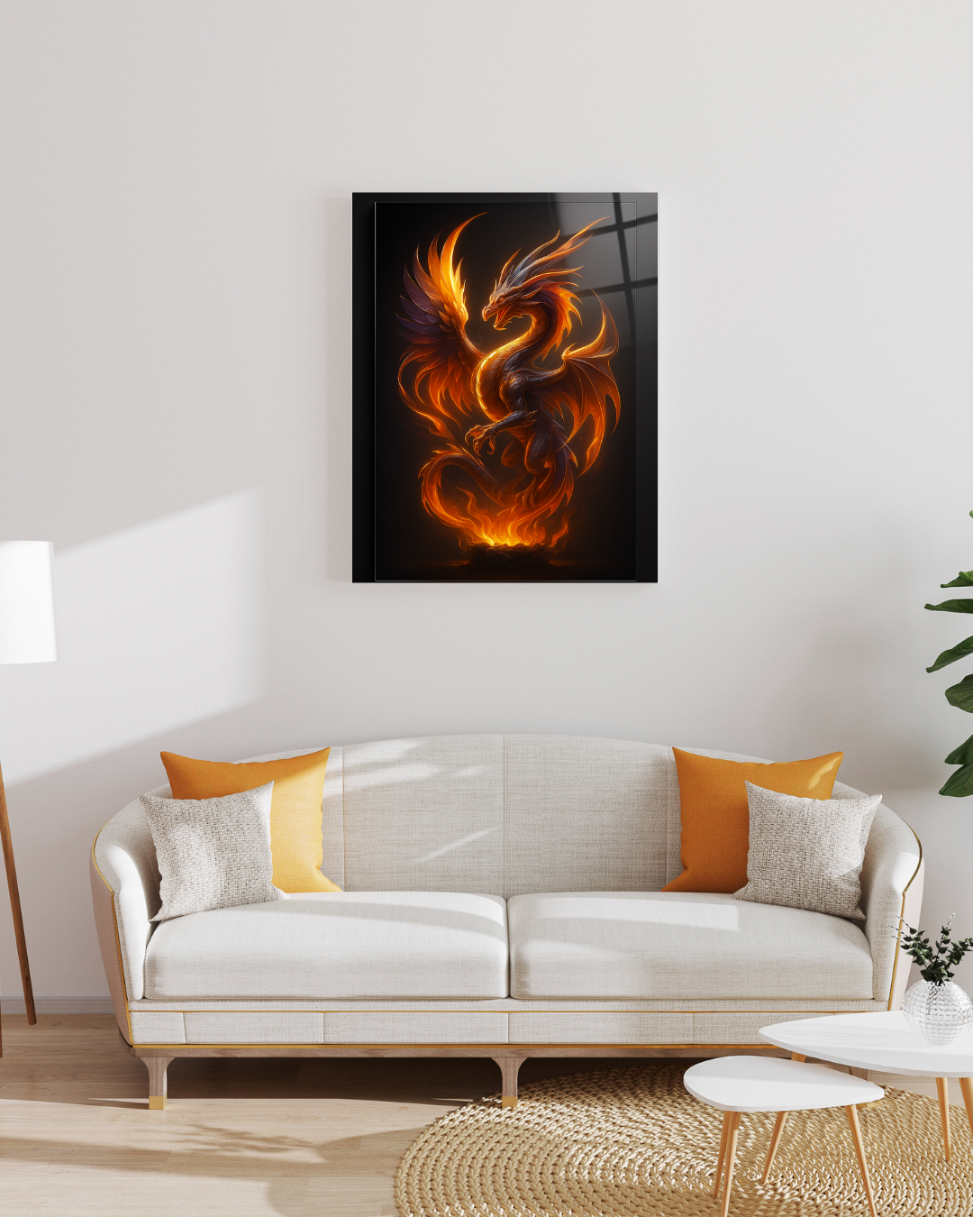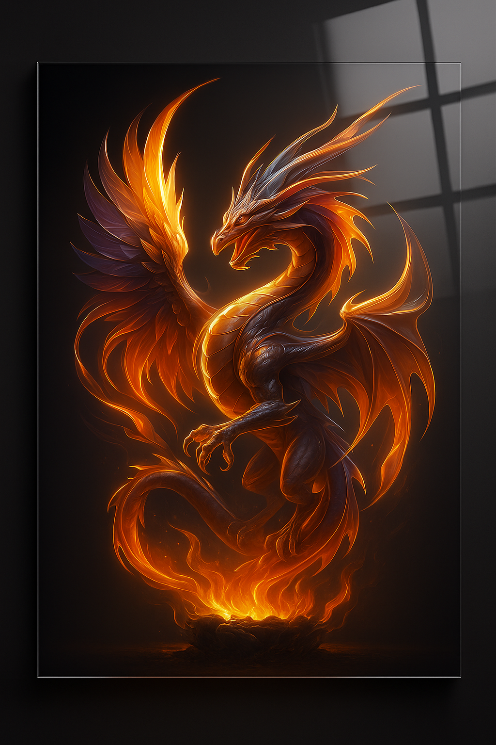 Unleash the fire within. Inferno Reign is a mesmerizing glass wall art featuring a majestic fire dragon rising from molten flames — a powerful symbol of strength, rebirth, and domination. With luminous orange embers and razor-sharp detail set against a deep black backdrop, this piece ignites any space with fierce energy and fantasy allure. Perfect for bold interiors, gaming rooms, or mythical art collectors.