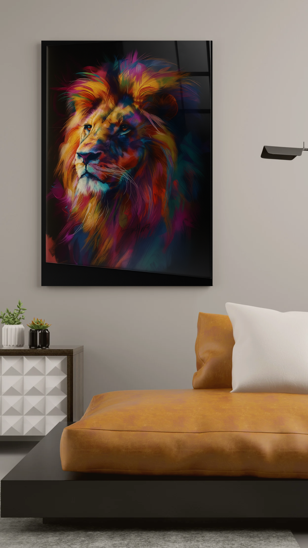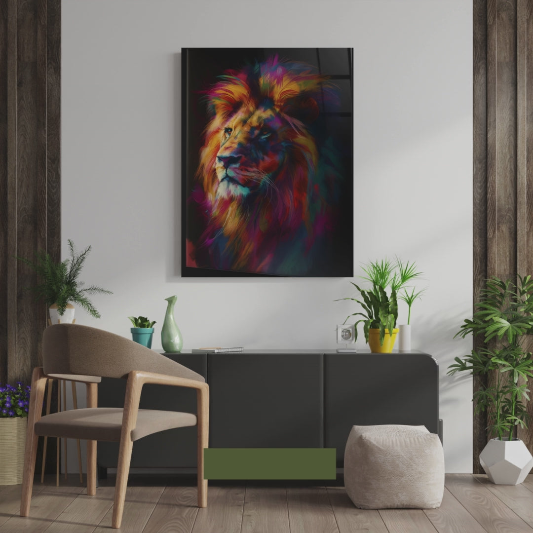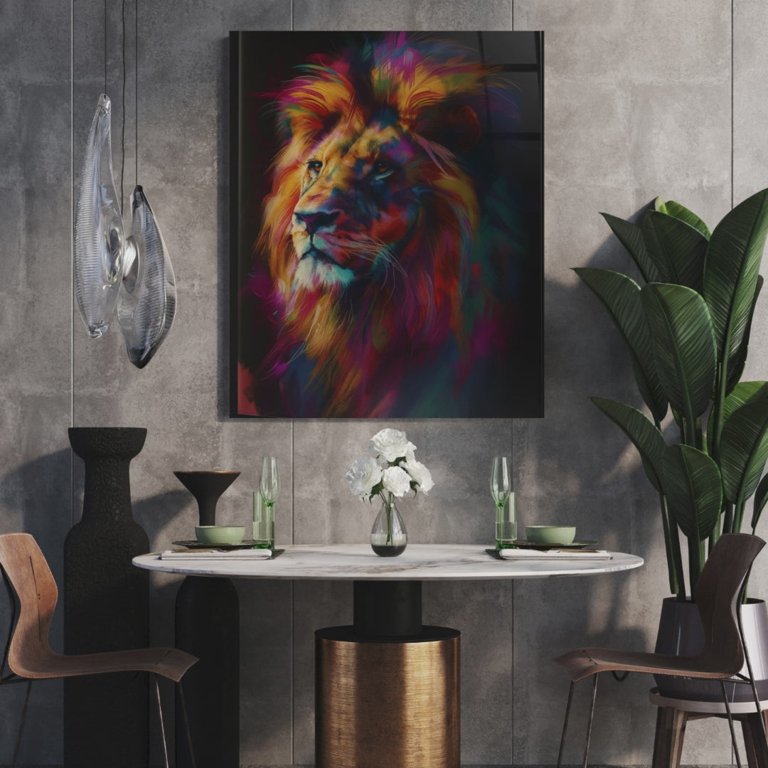 Unleash the wild within—King of Spectrum roars with fierce pride and hypnotic color. This glass wall art captures the majestic lion in a storm of electrifying hues, blending raw power with artistic passion. A bold centerpiece for any space, where strength meets untamed beauty.