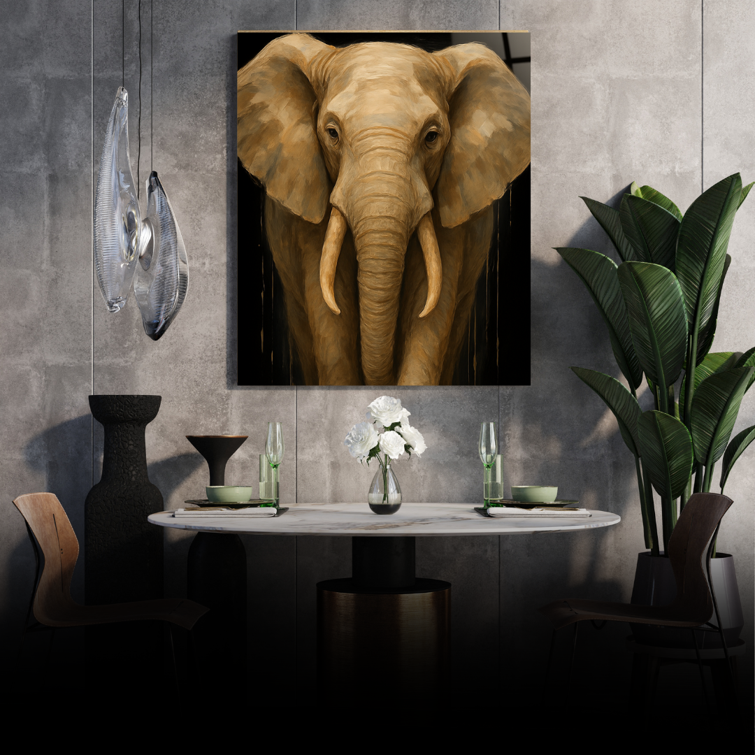 A powerful presence captured in serene grace. Majestic Stillness is a stunning glass wall art featuring a lifelike, hand-painted style portrait of an elephant — symbolizing wisdom, strength, and grounding energy. The rich earthy tones and glossy finish add depth and elegance, making it a perfect centerpiece for modern, rustic, or nature-inspired interiors. A tribute to the soul of the wild.