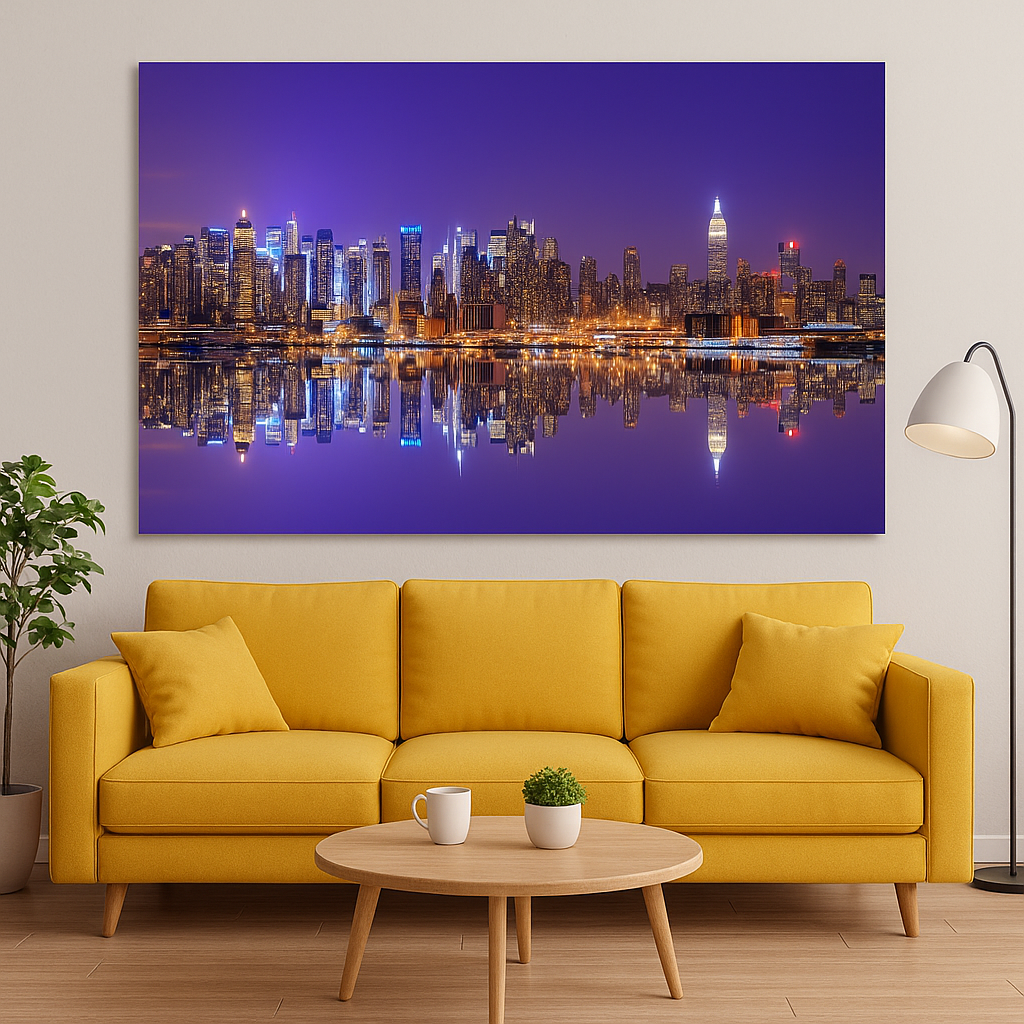Immerse yourself in the pulse of the city with Midnight Metropolis — a stunning glass wall art piece capturing a glittering skyline mirrored flawlessly against tranquil waters. The rich purples, golden lights, and crisp architectural details bring modern sophistication to your space, making it perfect for those who thrive on urban energy and timeless elegance.