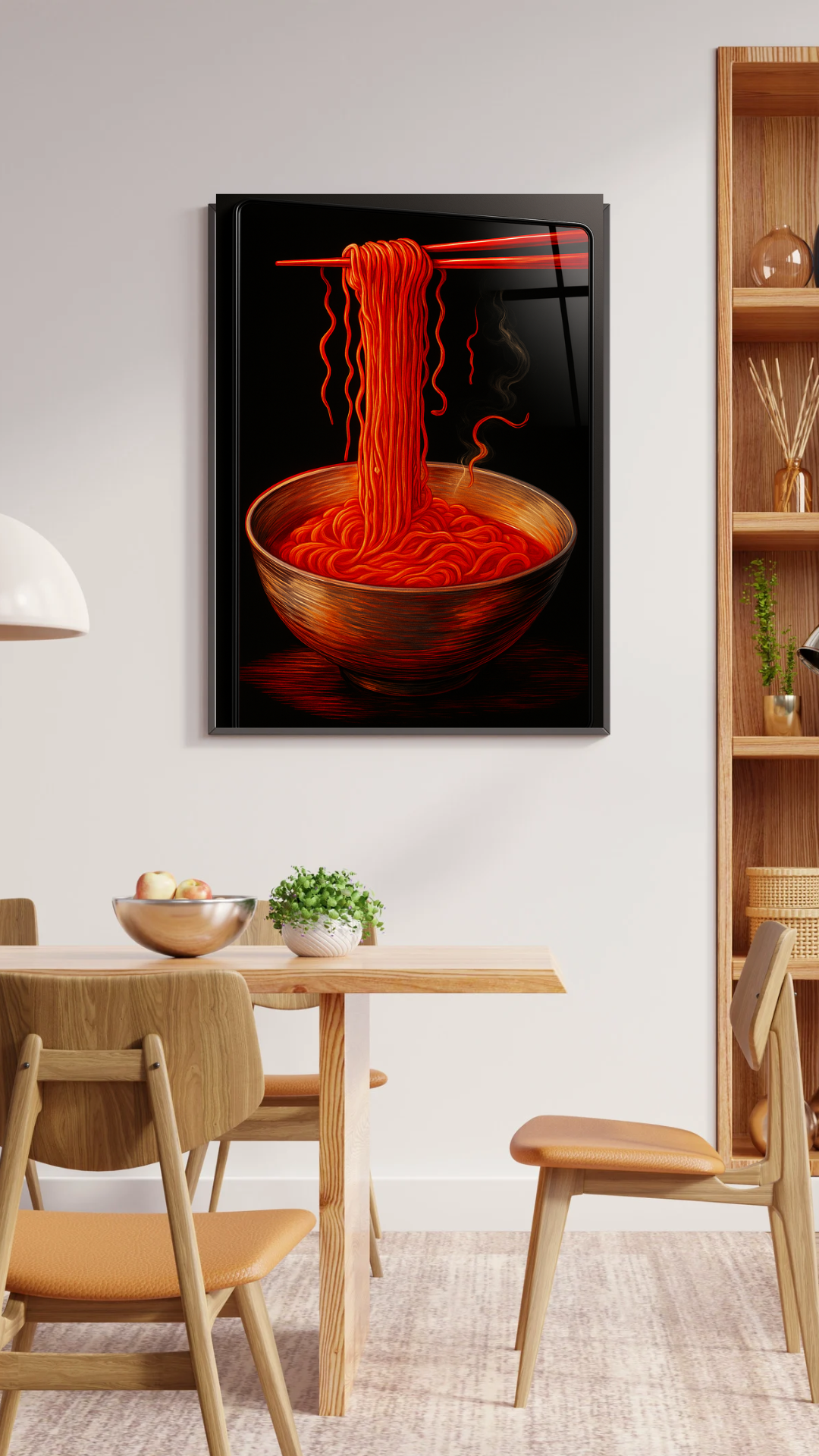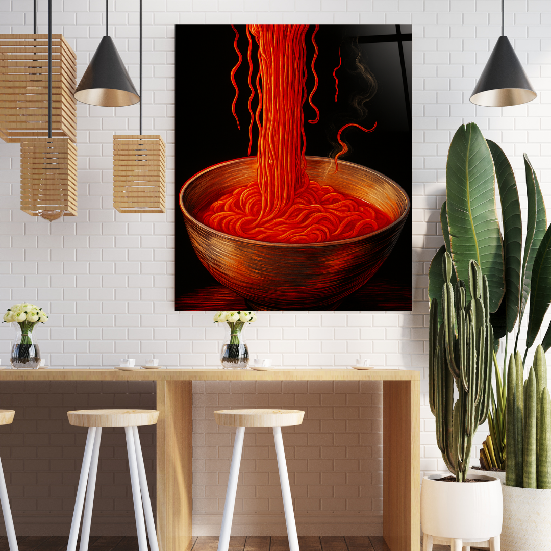 Bold, steamy, and irresistibly rich—Midnight Ramen captures the soul of comfort food in glowing crimson tones. With glossy glass depth and dramatic shadows, this wall art turns a simple bowl of noodles into a statement of warmth, flavor, and late-night cravings. A must-have for kitchens, cafés, or modern dining spaces.