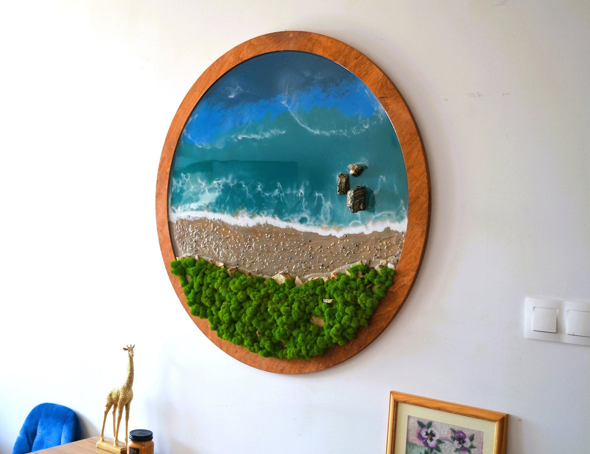 Immerse your space in coastal tranquility with Moss & Tide Luxe. This handcrafted wall art blends vibrant preserved moss, natural wood, and flowing ocean resin to create a stunning 3D shoreline scene — a luxurious statement piece that radiates nature’s beauty year-round.
