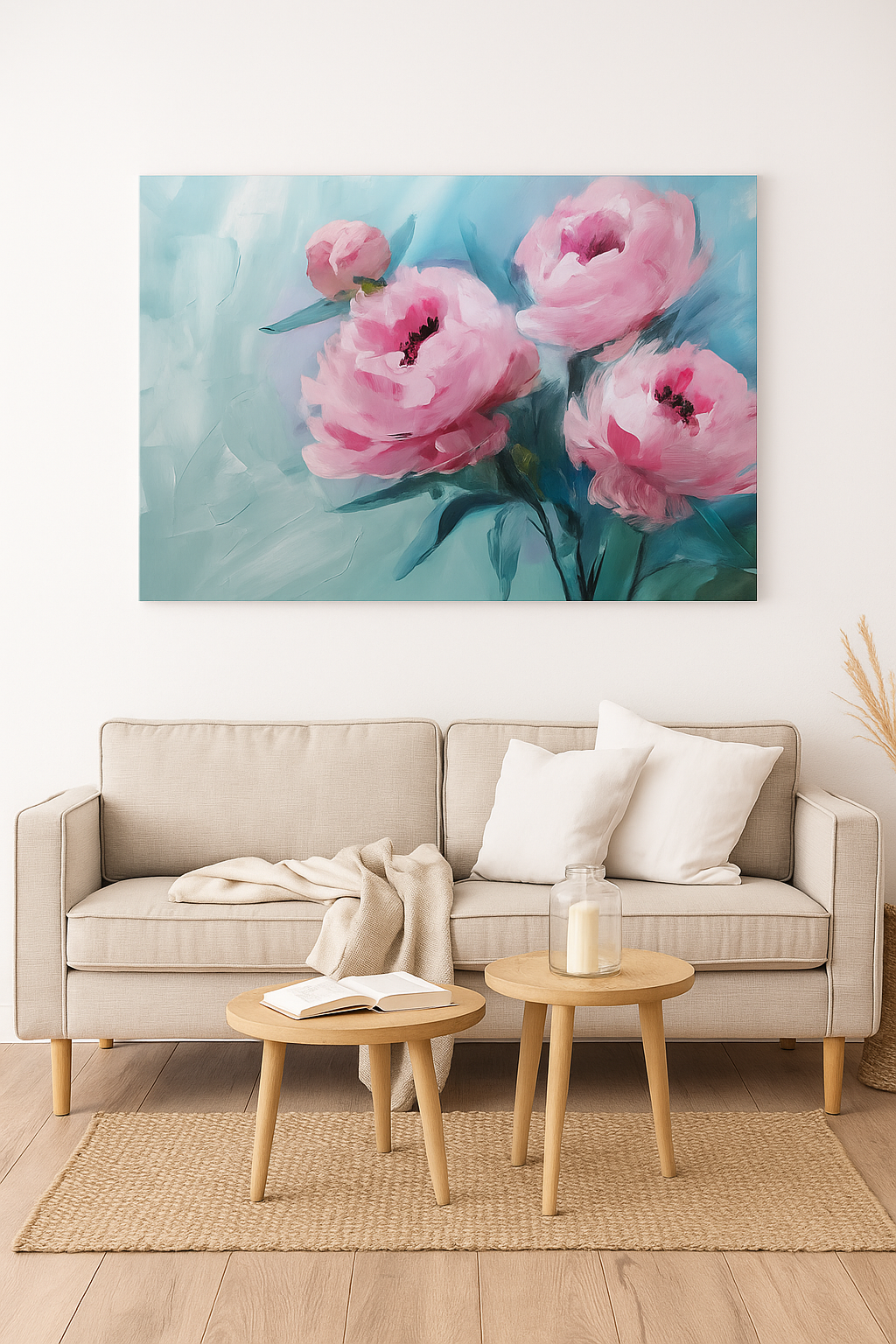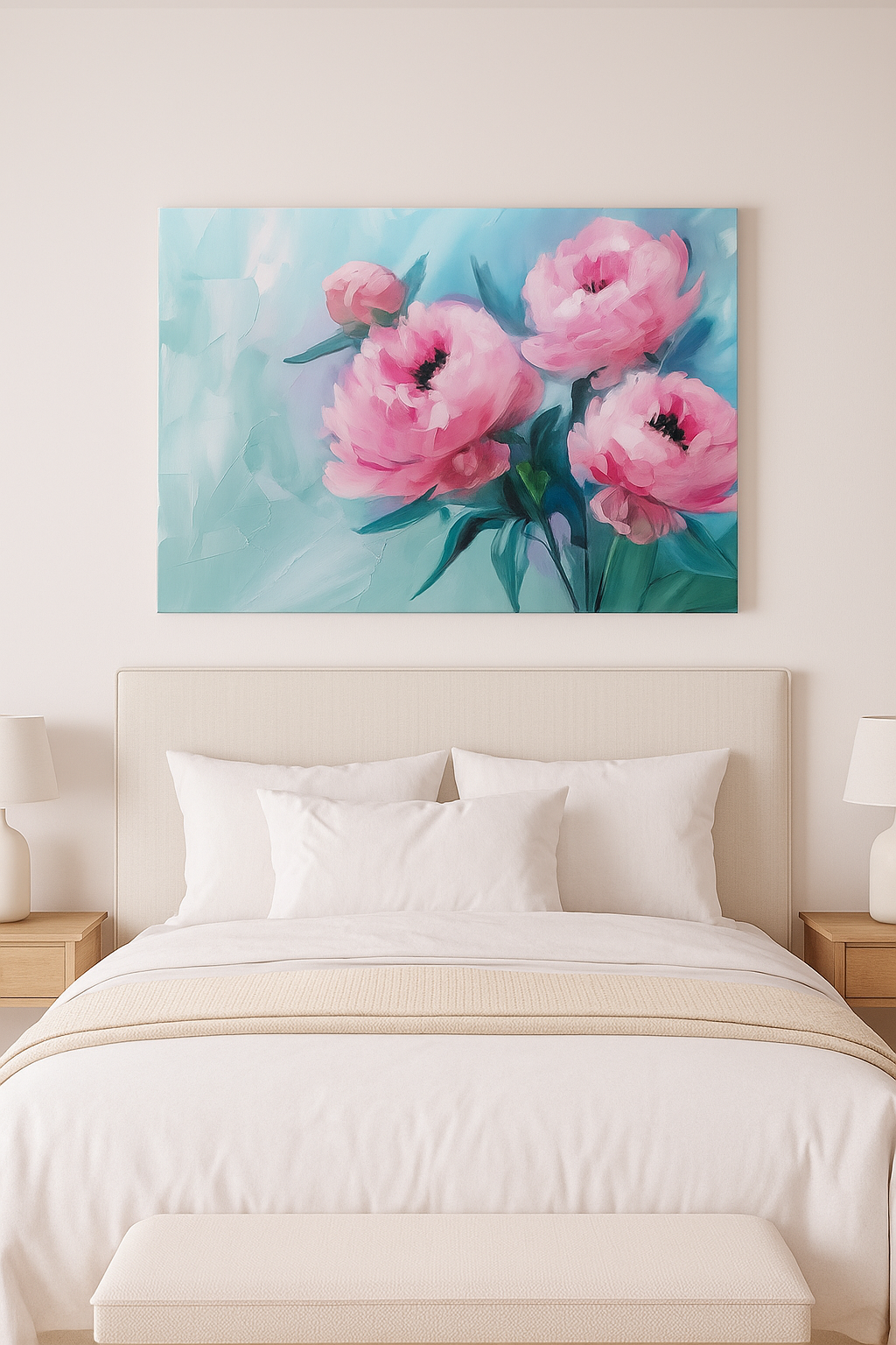Bring elegance into bloom with Petal Poise — a soft, textured portrayal of pink peonies in full flourish. Brushed in serene blues and blush tones, this floral canvas evokes freshness and grace, perfect for brightening up your living space with a refined botanical charm.