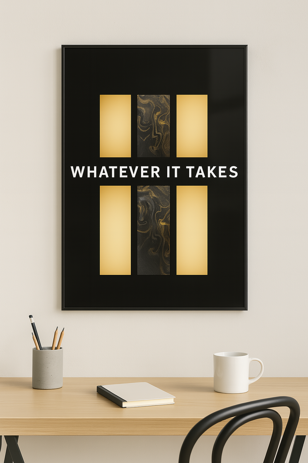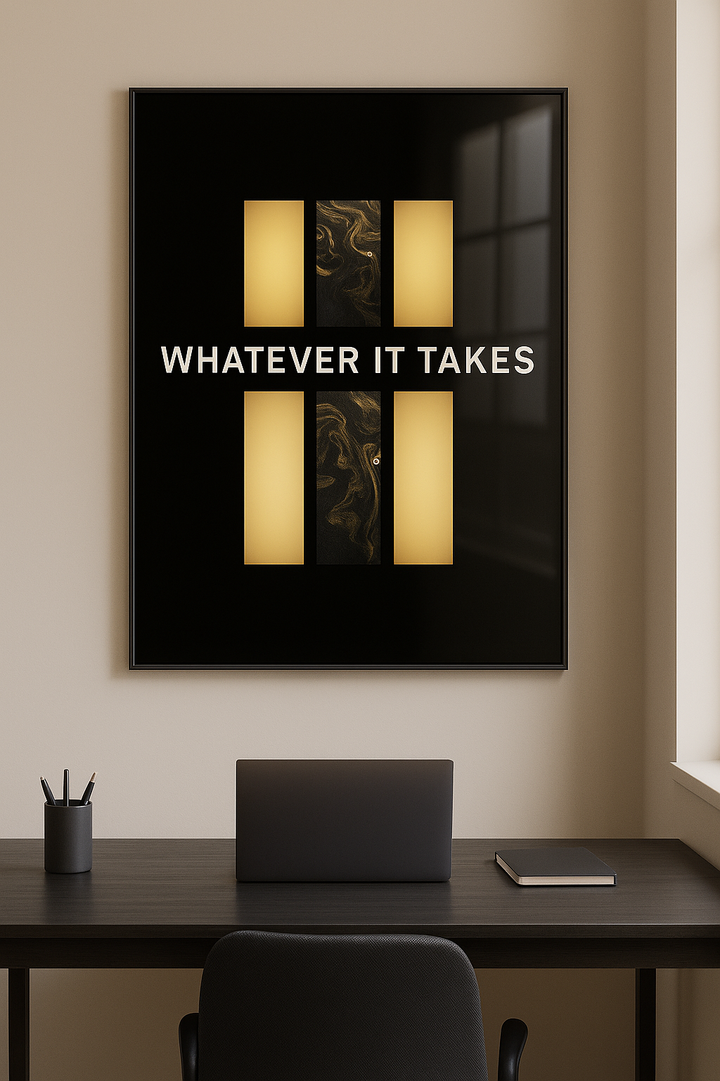 Fuel your ambition with Relentless Drive — a bold fusion of gold gradients and marble textures, framed by the commanding words “Whatever It Takes.” Printed on high-gloss tempered glass, this piece radiates strength, focus, and unstoppable energy. Built to inspire leaders, risk-takers, and visionaries.