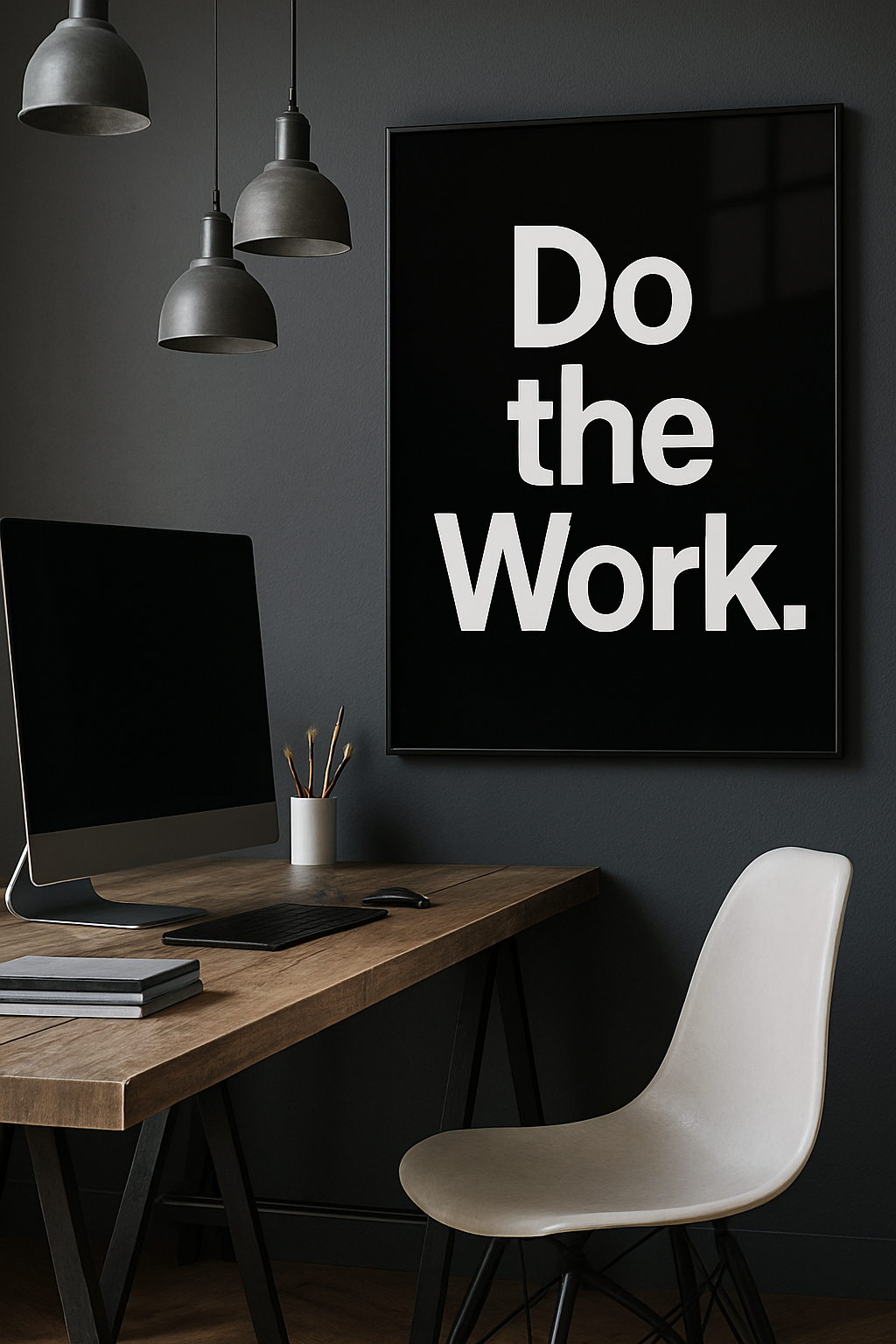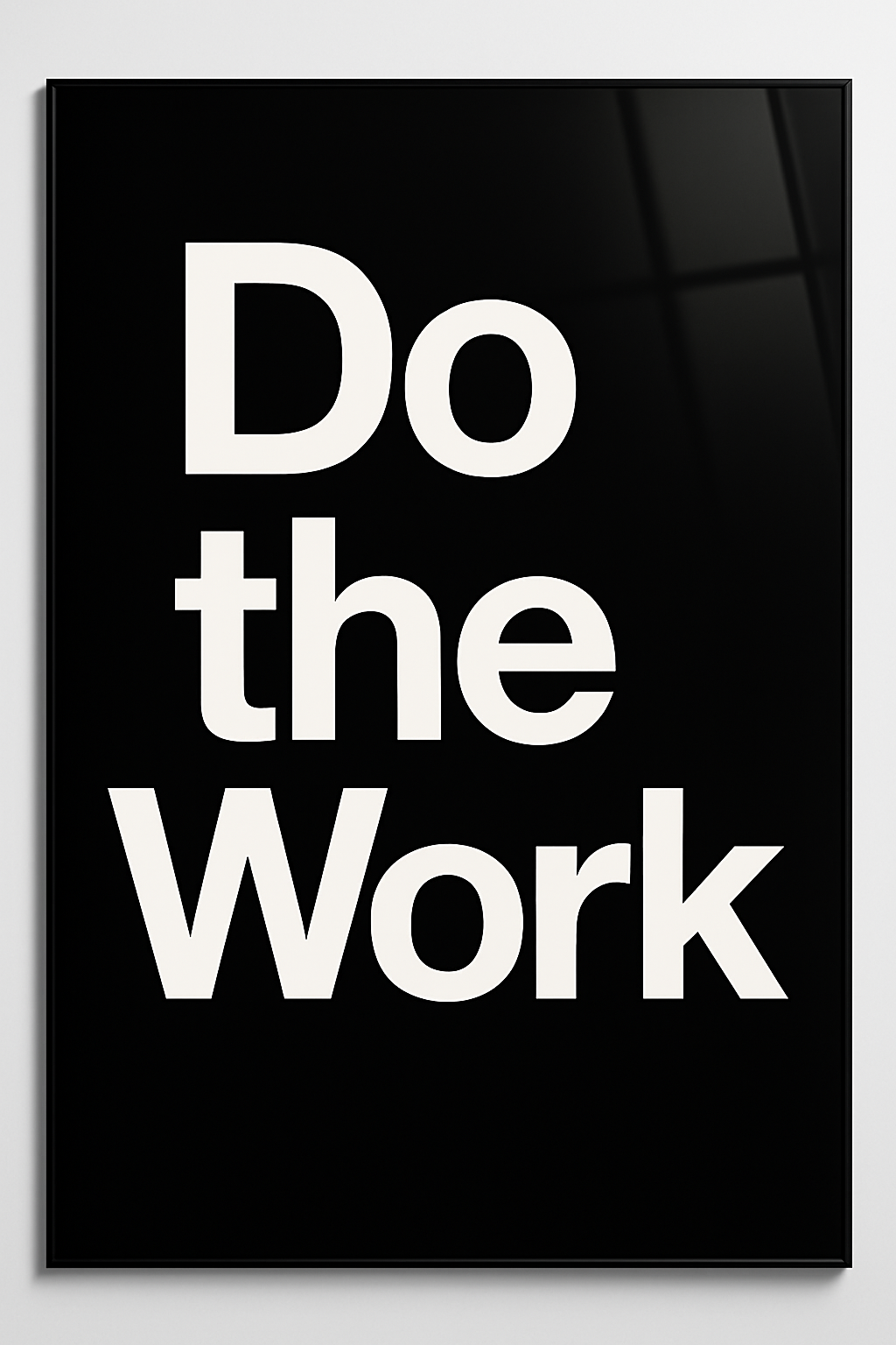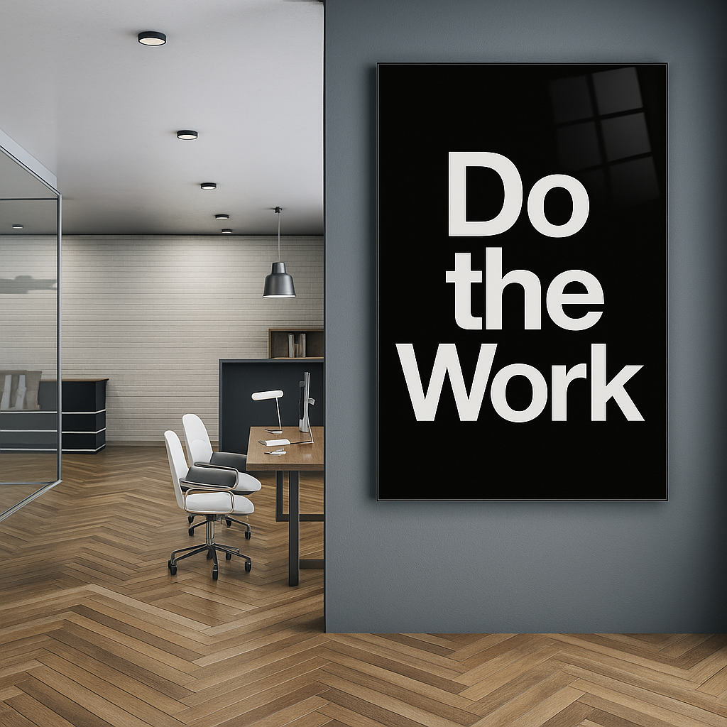 Unleash unstoppable energy with Relentless Grit. This bold glass art commands focus with the words “Do the Work” in striking white over a jet-black backdrop. Finished with a high-gloss sheen and gallery-style reflection, it’s made to fuel ambition in any workspace or studio. Built for go-getters who don't wait for results — they create them.