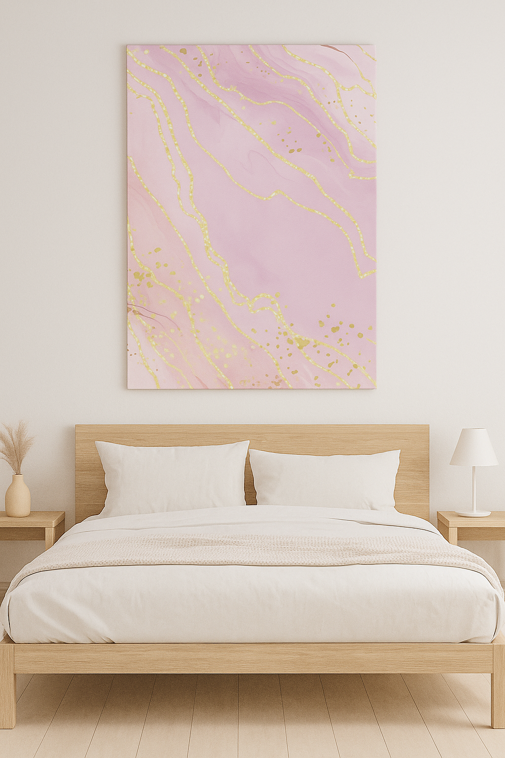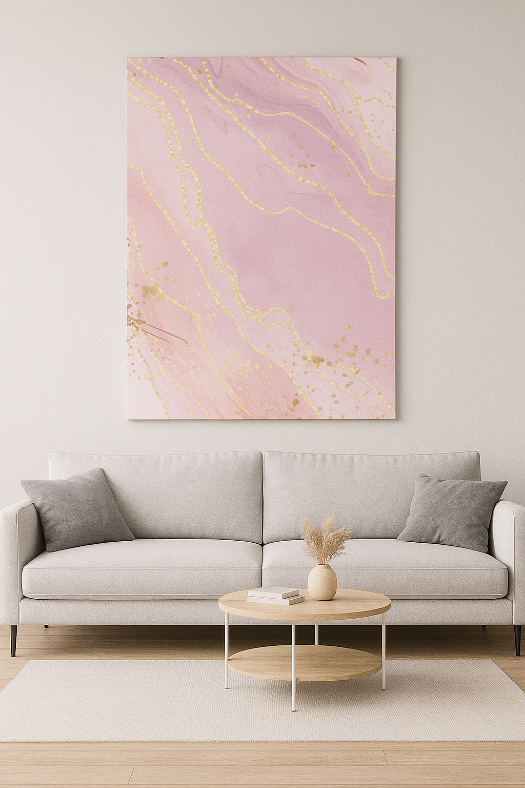 Infused with opulence, Rosé Veins is a sophisticated blend of blush marble and gilded accents. The gold-flecked streams shimmer with elegance, making this artwork a statement of refined taste and timeless charm.