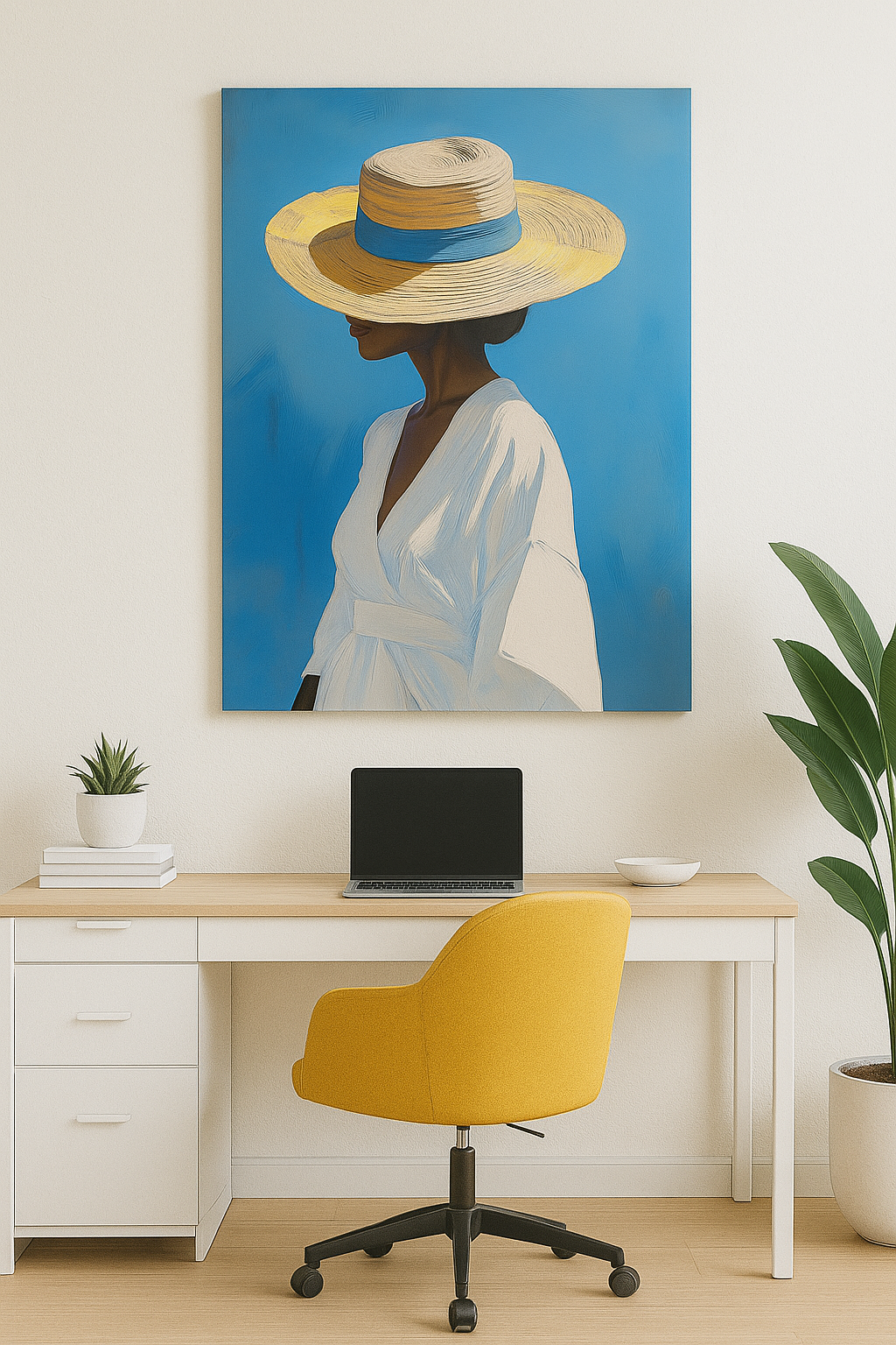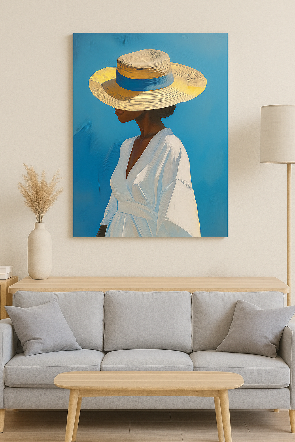 With her face half-veiled in golden straw, Sunlit Muse is an ode to quiet confidence. Clean lines, a rich palette, and effortless silhouette make this piece a modern icon of refined femininity.