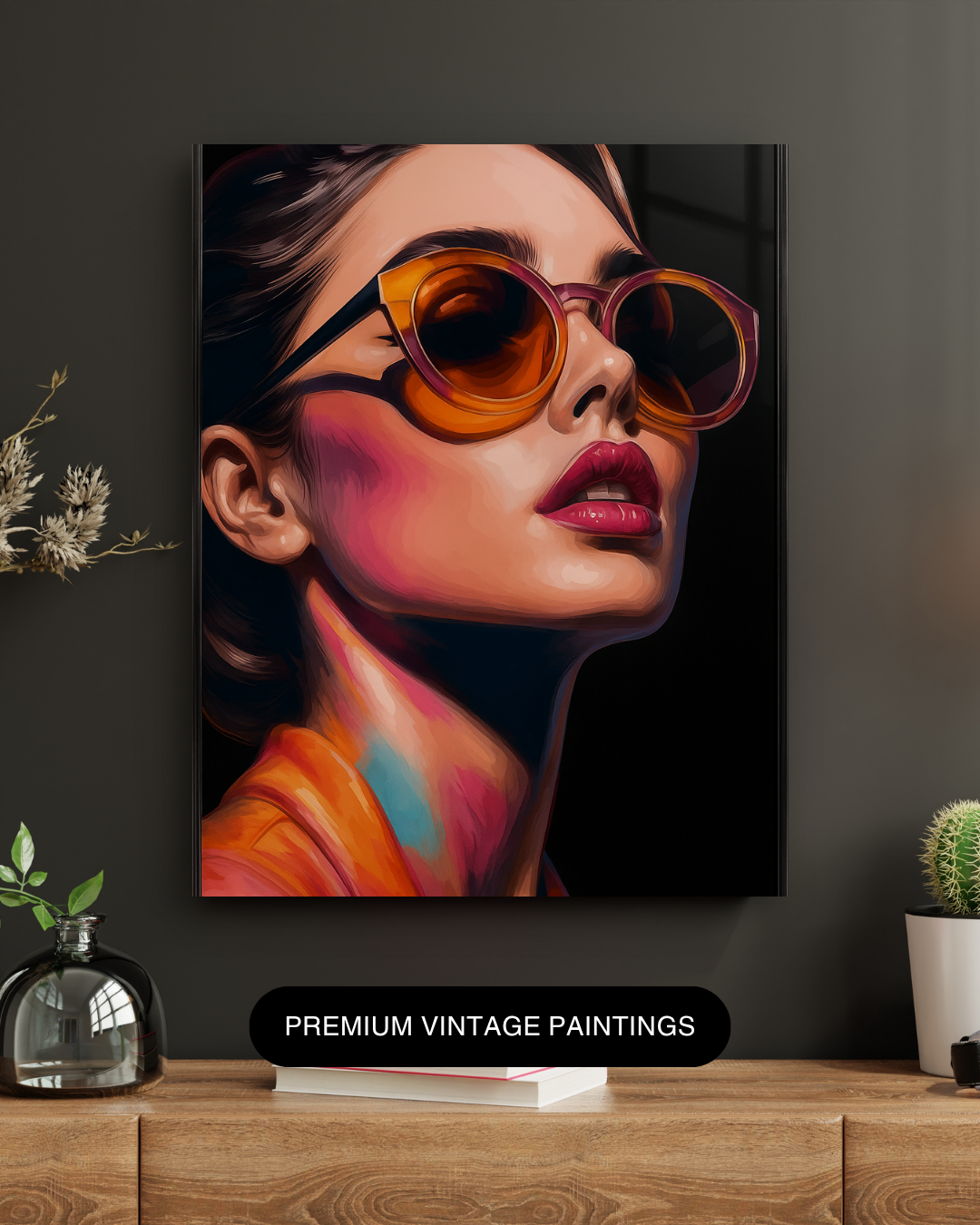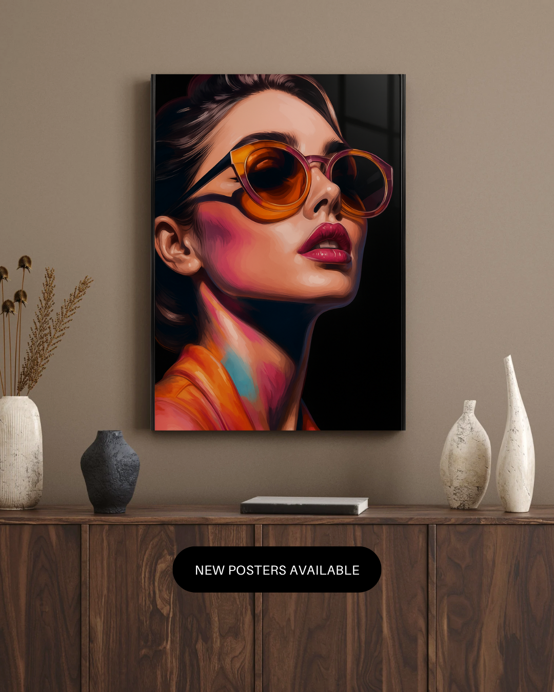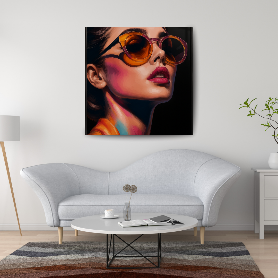 Fierce, bold, and unapologetically glam—Sunset Attitude captures a modern muse in oversized amber shades and luminous hues. This high-gloss glass wall art radiates confidence and charisma, making it the perfect statement piece for fashion-forward spaces.