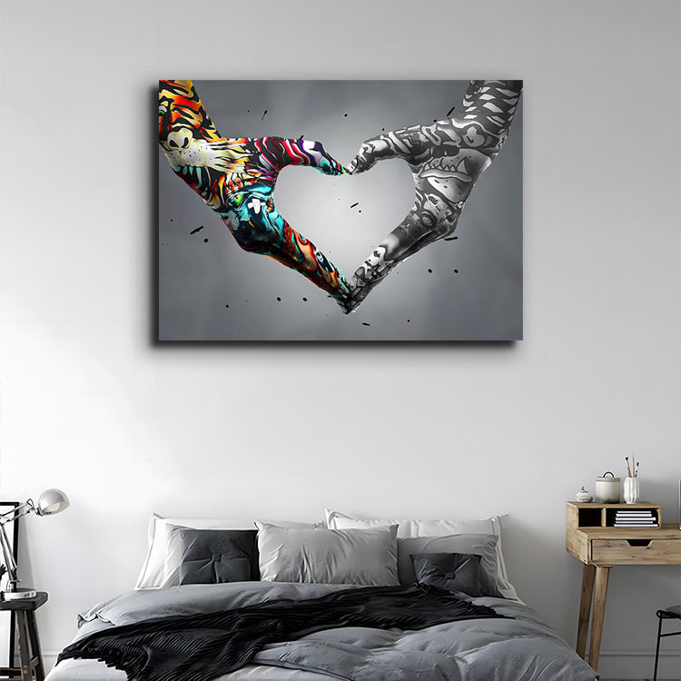 Two hands—one vibrant, one monochrome—form a heart that defies contrast. Unity Pulse is a bold visual metaphor for balance, connection, and the electric energy of love that transcends color, culture, and chaos. A statement piece that speaks to harmony in diversity, perfect for modern interiors with soul.