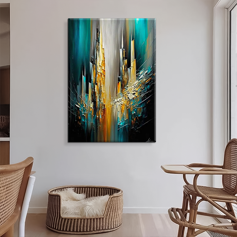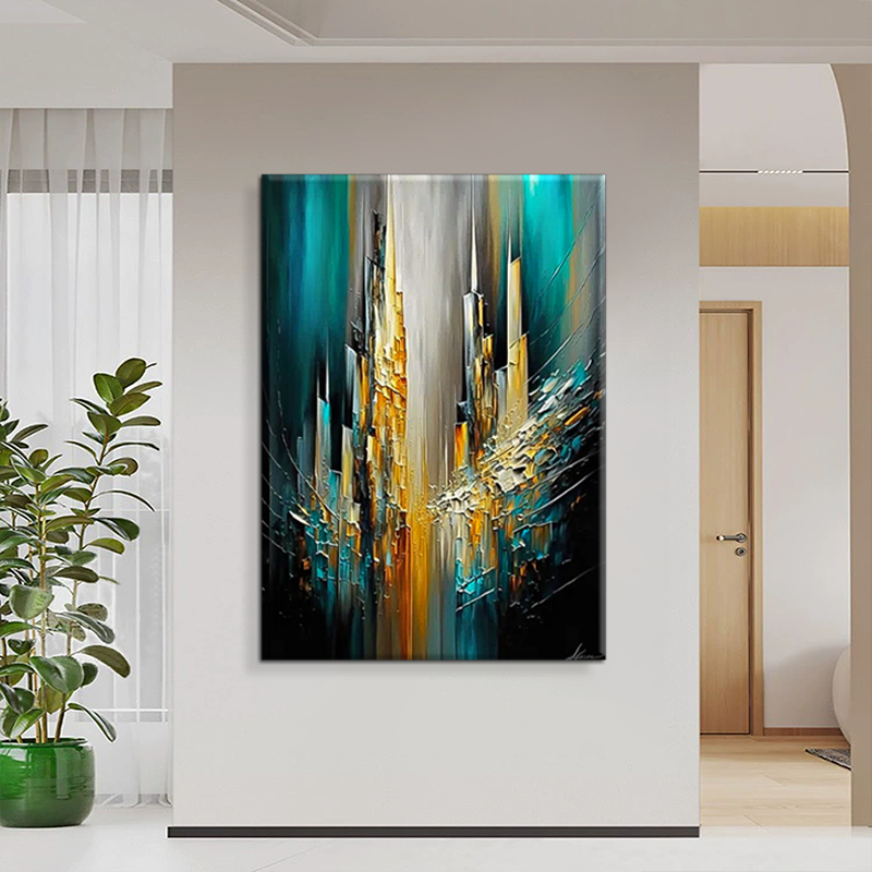 Urban Ascend is a commanding fusion of modern architecture and abstract elegance. Rich strokes of gold, teal, and charcoal rise like a futuristic skyline—symbolizing ambition, innovation, and transformation. Ideal for contemporary spaces craving a sense of movement, power, and luxury.