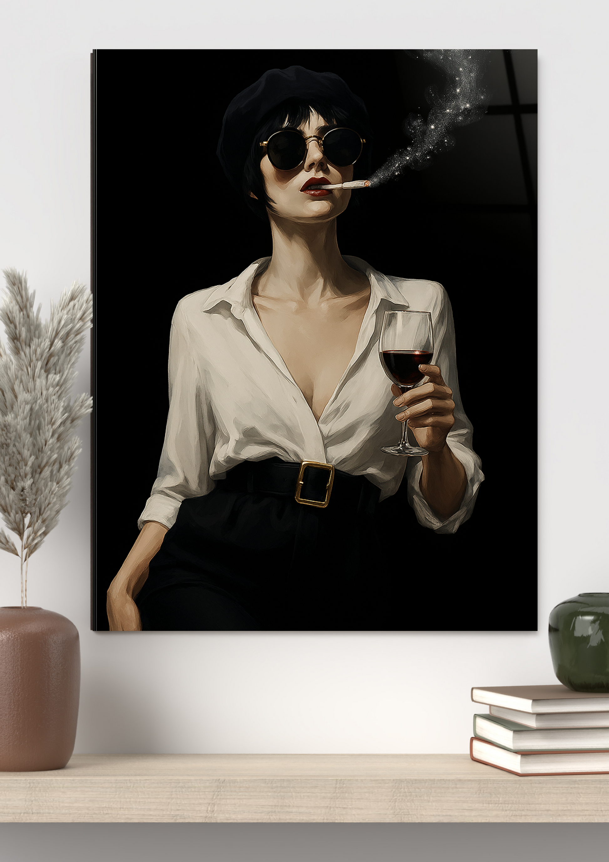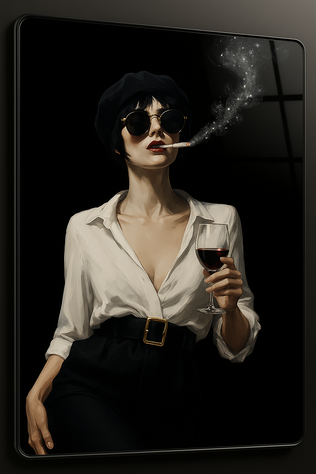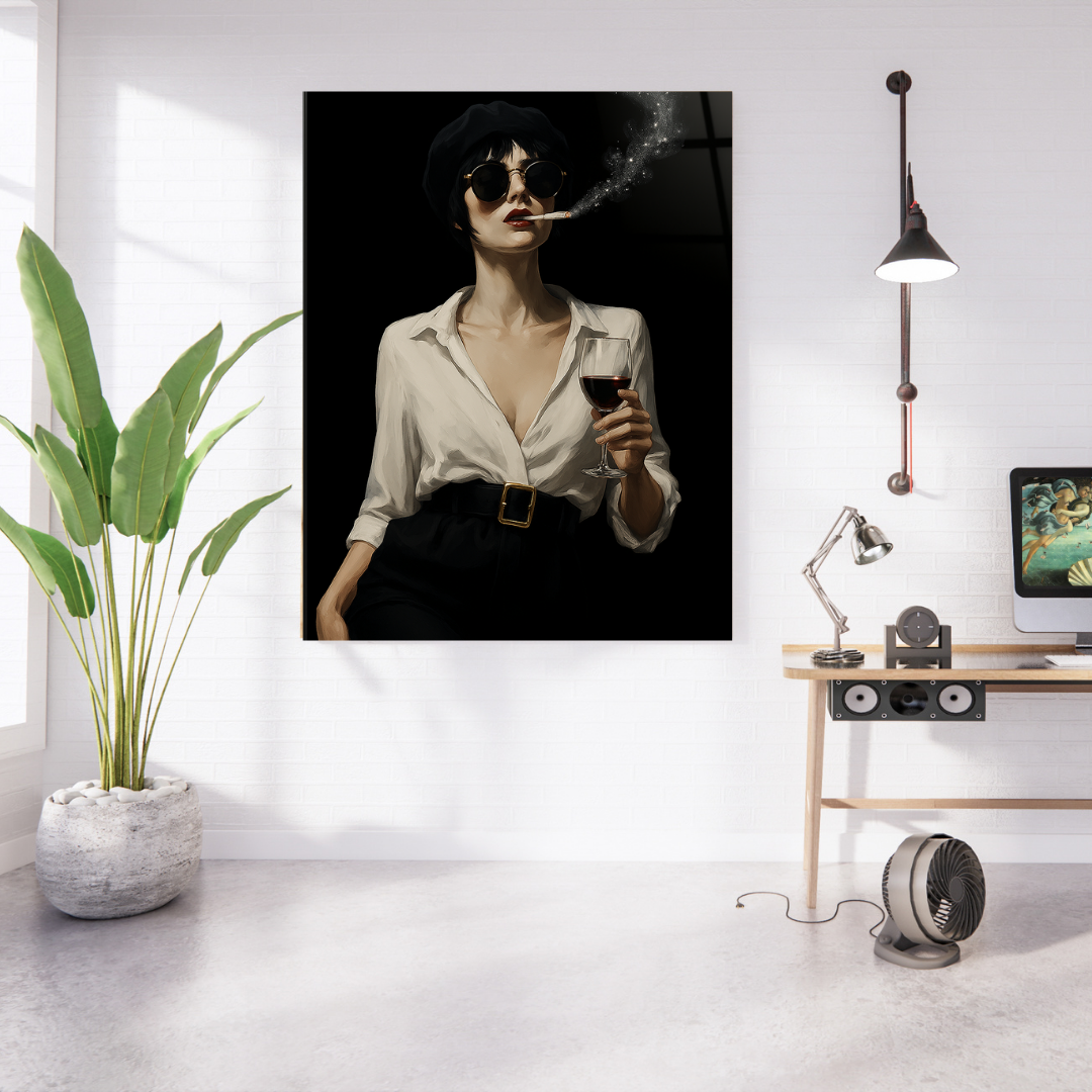 Dripping with noir glamour and unapologetic attitude, Velvet Vice captures a mysterious femme in dark shades, cigarette smoke curling like stardust, and a glass of red in hand. Framed in high-gloss glass, this bold wall art oozes elegance, rebellion, and vintage seduction—perfect for edgy, modern spaces.