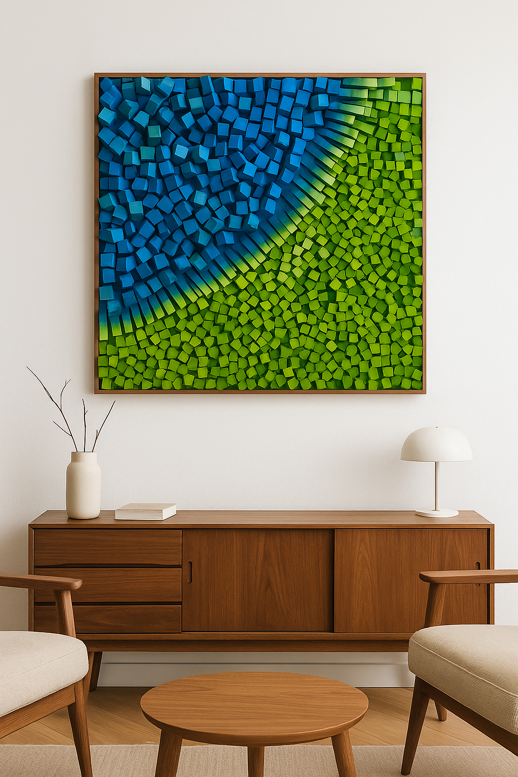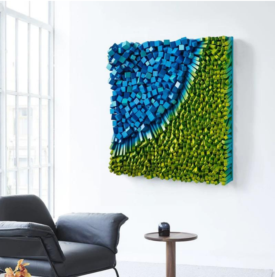 Bring an energetic burst of nature and motion into your space with Verdant Surge. This handcrafted wooden wall art is meticulously formed from individually cut pine cubes, painted in vibrant gradients of ocean blue and lush green. Each piece is arranged to create a striking, wave-like transition, evoking both serenity and vitality. A true statement piece, perfect for modern interiors seeking a bold yet organic touch.