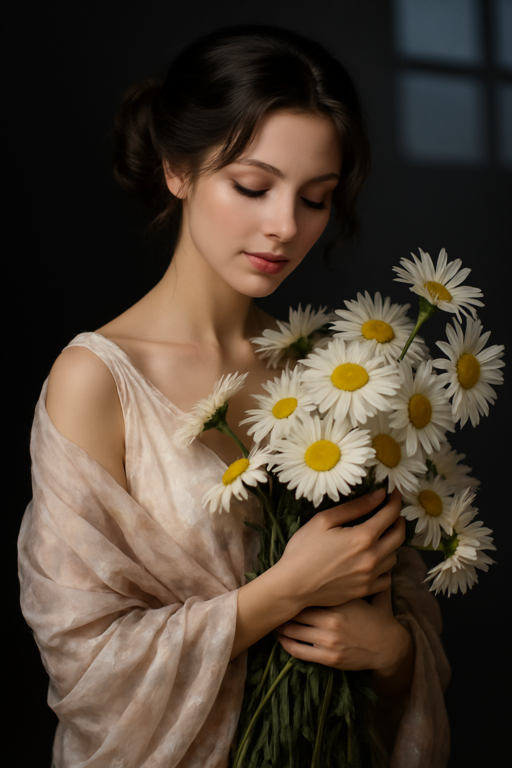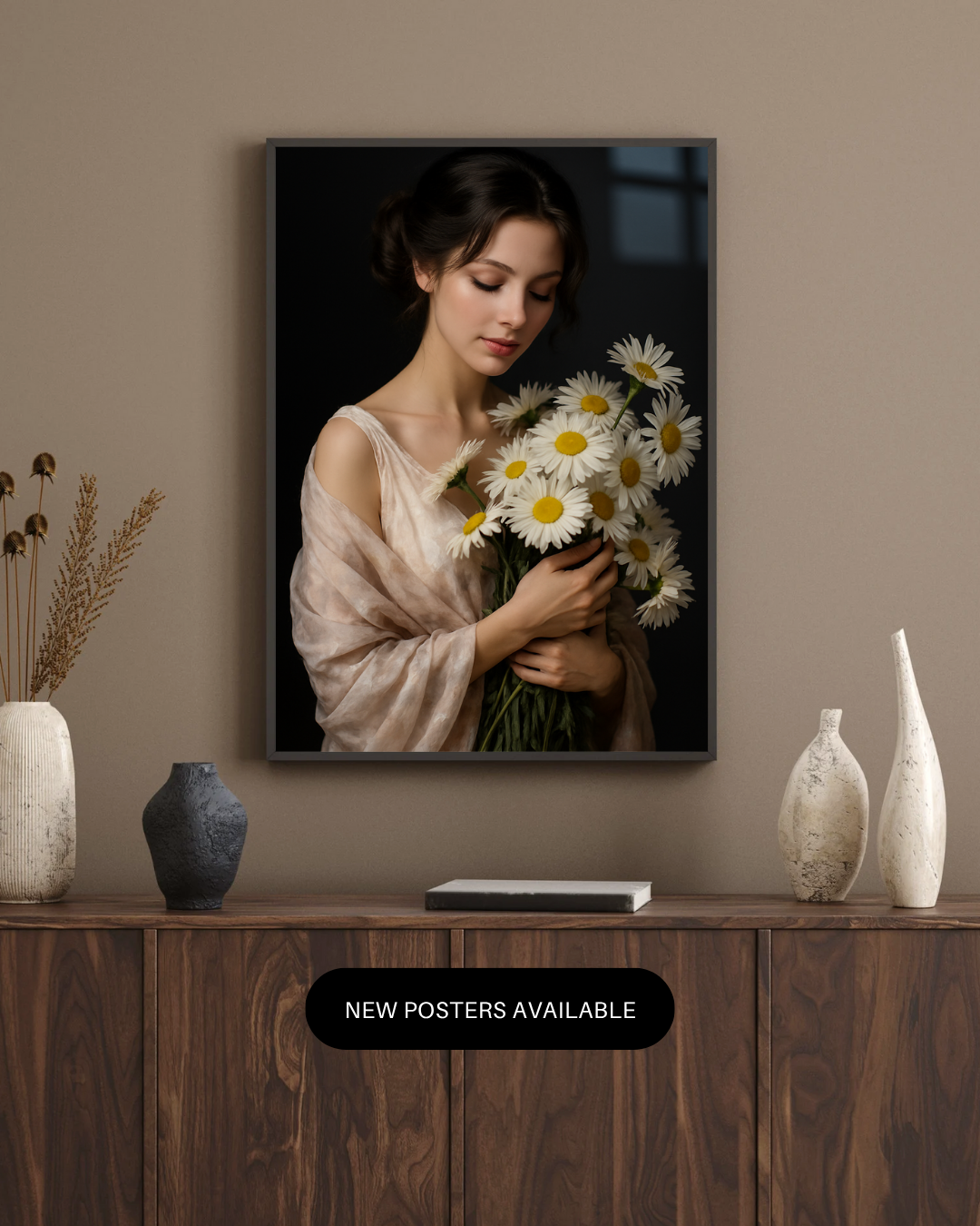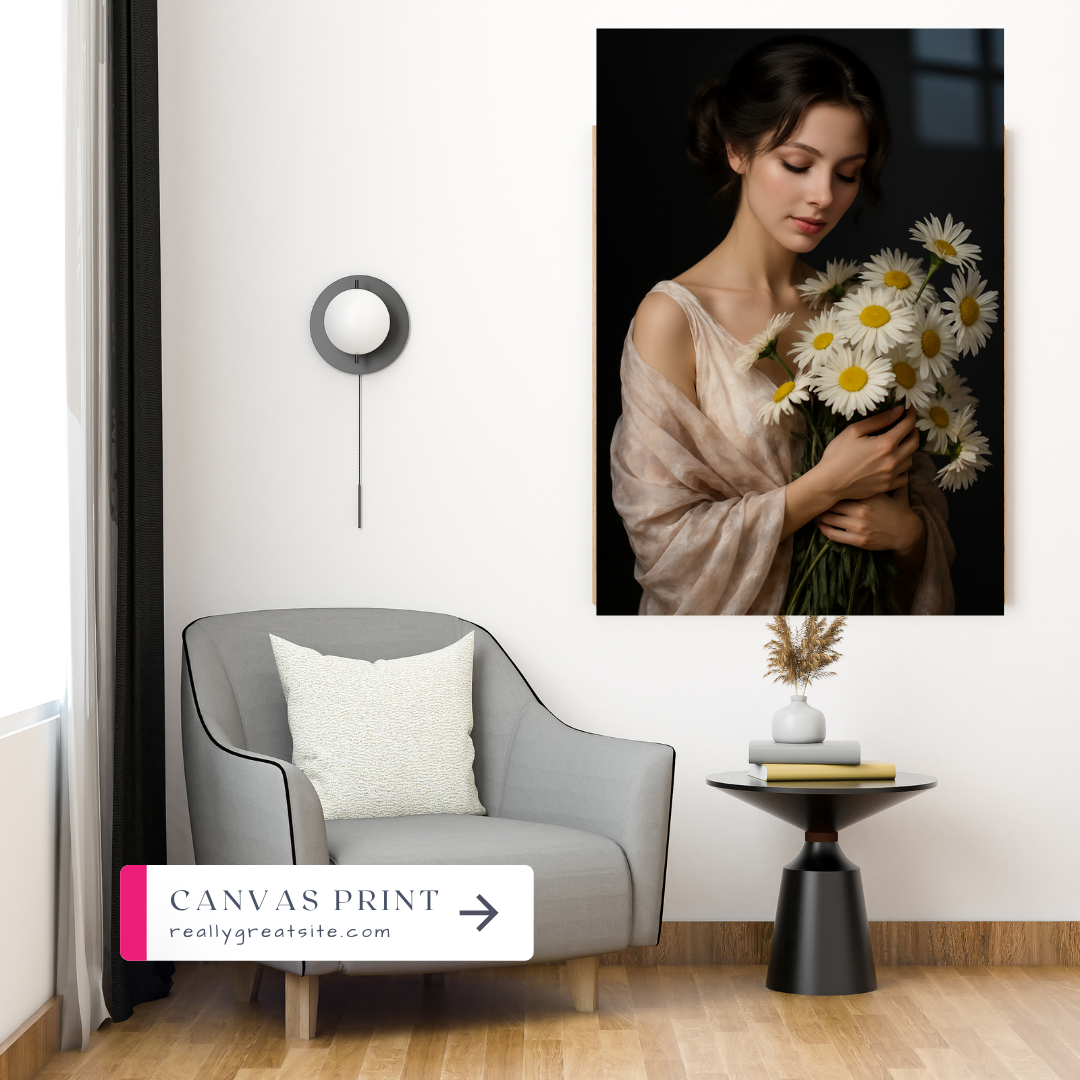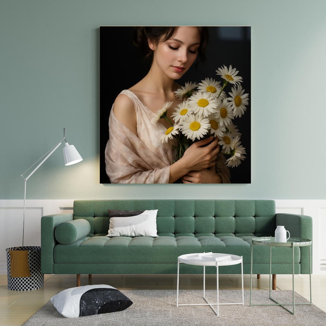 Soft as a sigh, Whispers in Bloom captures a quiet moment of grace — a delicate beauty holding daisies close, wrapped in light and serenity. Printed on elegant glass, this artwork radiates femininity, purity, and poetic stillness. Perfect for romantic interiors, bridal spaces, or anyone who finds beauty in simplicity and the language of flowers.
