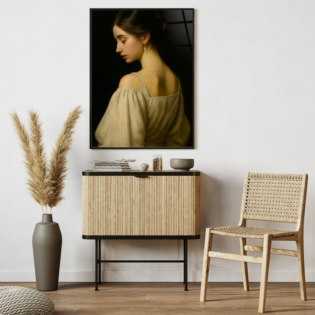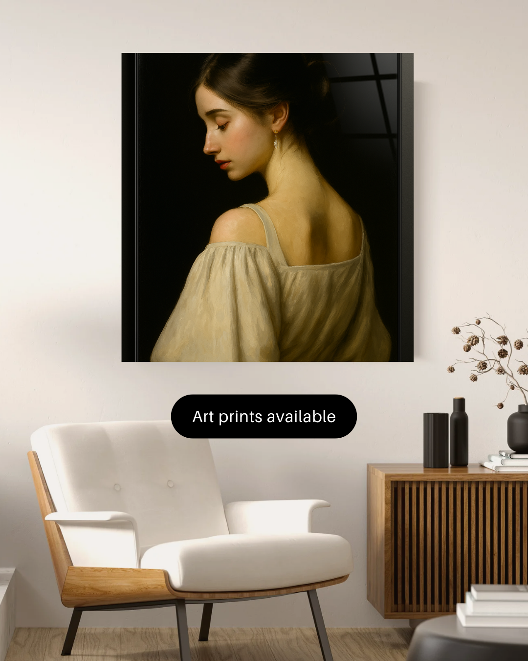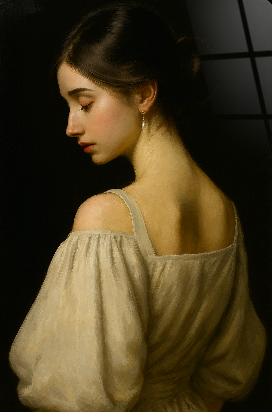 Solitude in Ivory evokes the quiet poetry of a woman lost in thought, her profile turned in graceful reflection beneath a soft, painterly glow. Printed on high-gloss glass, this artwork blends classical elegance with contemporary refinement — ideal for serene bedrooms, reading nooks, or art spaces that embrace stillness, softness, and timeless beauty.